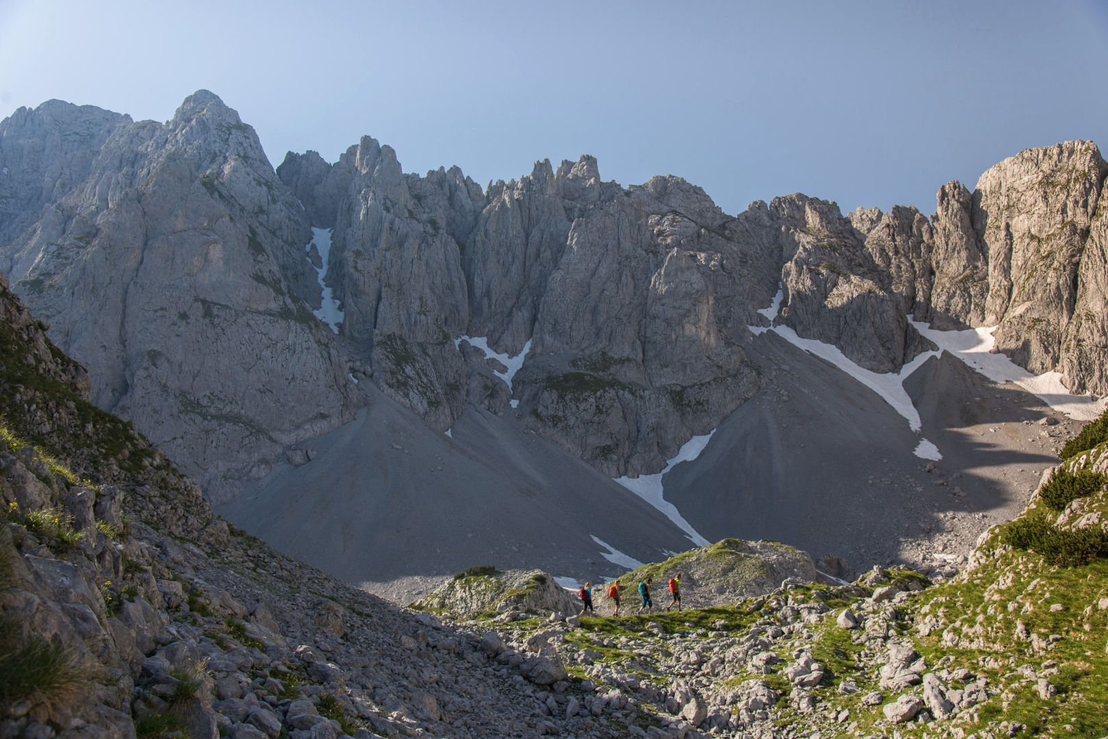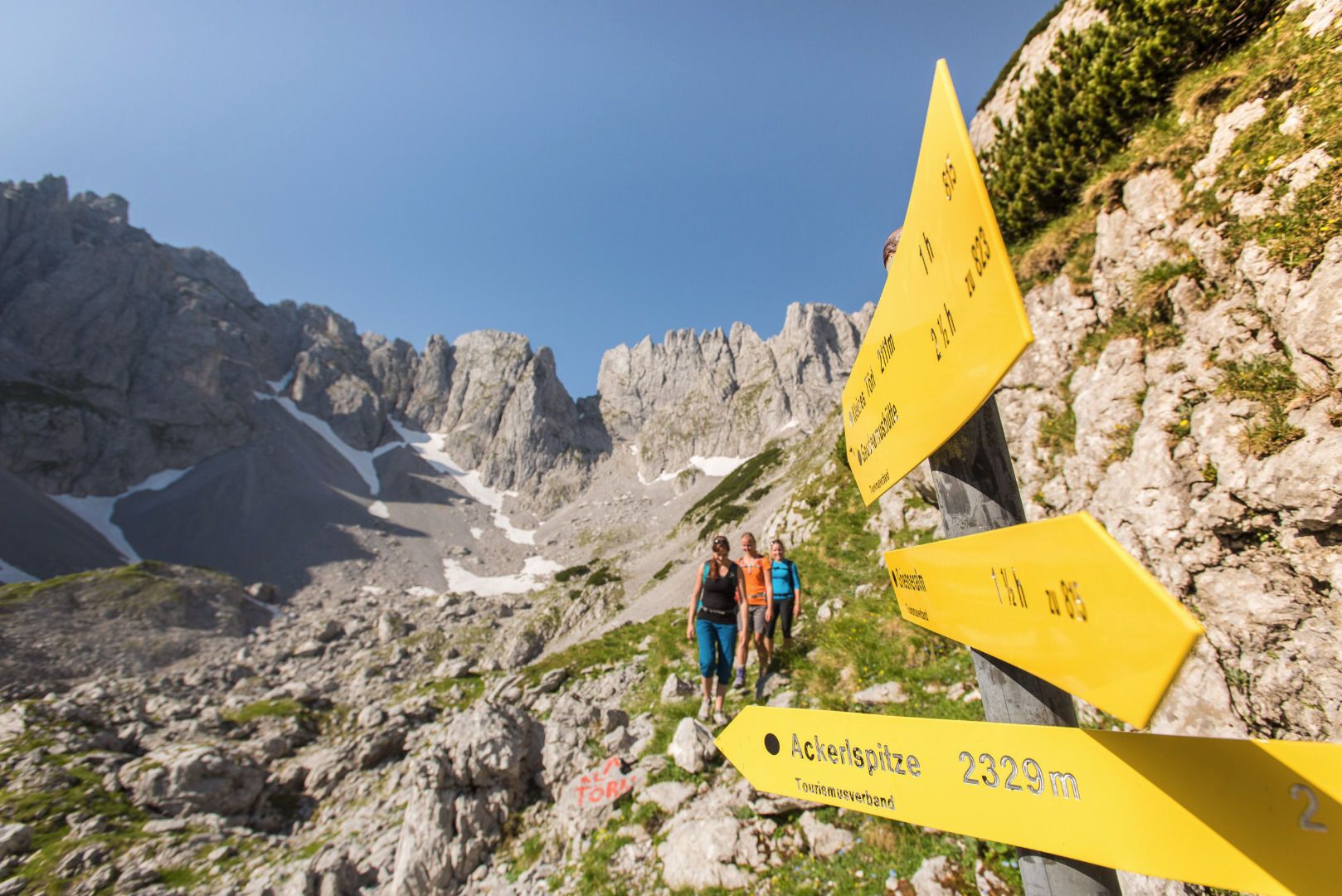 Gestartet wird die Wanderung bei der Griesner Alm. Zunächst führt sie entlang eines gut ausgebauten Wanderweges. Bei der ersten Abzweigung wählen Sie den Weg in Richtung Fritz-Pflaum-Hütte. Flankiert von Mitterkaiser, Predigtstuhl und Hinterer Goinger Halt führt der Bergweg durch das Große Griesner Tor hinauf zur Fritz-Pflaum-Hütte im Griesner Kar. Hier bietet sich ein atemberaubender Blick auf die umliegenden Gipfel des Wilden Kaisers. Entlang der Wände vom Kleinkaiser führt der Bergweg hinüber zum Kleinen Törl. Achtung: In diesem Bereich sind zahlreiche Gämse unterwegs, deshalb sollte man unbedingt einen Helm wegen möglichem Steinschlages tragen. Begleitet von beeindruckenden Bildern, die sich Ihnen bieten, wandern Sie hinauf auf das 2100 Meter hoch gelegene Kleine Törl. Über den wunderschönen Gildensteig gehen Sie vorbei an der Wilderer Kanzel hinunter zum Bergsteigergrab am Brennenden Palven. An dieser Stelle wurde am 17. Oktober 1952 der Lehrer Much Wieser, ein großer Liebhaber des Wilden Kaisers, beigesetzt. Weiter wandern Sie hinunter zur Oberen Regalm und von hier aus gelangen Sie über die Graspoint Hochalm hinunter zum Schleierwasserfall – dem Kletterparadies im Tiroler Unterland. Etwas unterhalb vom Schleier Wasserfall befindet sich die Graspoint Niederalm, eine kleine Jausenstation. Die Tour endet beim Parkplatz Hüttling in Going.