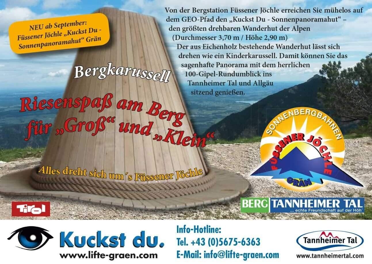 Kurzbeschreibung:Ein Spaß für die ganze Familie.Mit der 8er-Gondelbahn geht es bequem nach oben zum Füssener Jöchle. Von der Bergstation gelangt man auf einem leichten Wanderweg in ca. 1/4 Stunde zum herrlichen Aussichtspunkt dem Sonnenpanoramahut. Der Hut aus Eichenholz dreht sich wie ein Karusell und auf der Hutkrempe sitzend kann der herrliche Panoramablick in Tannhimer Tal und Allgäu genoßen werden. Er ist der größte drehbare Wanderhut der Alpen. Gehtzeit ca 1/2 Stunde.Die von uns ausgewählten Barrierefreien Wege und Ausflugsziele laden auch Familien und Menschen mit Mobilitätshilfen zum Entdecken ein: Sie sind überwiegendasphaltiert oder gut geschottert und meist problemlos mit Kinderwagen oder Rollstuhl zu befahren – bei einzelnen Passagen kann eine helfende Hand jedoch von Vorteil sein. Erlebniswert: ******Empfohlene Jahreszeiten:JanuarFebruarMärzAprilMaiJuniJuliAugustSeptemberOktoberNovemberDezemberEigenschaften:RundtouraussichtsreichEinkehrmöglichkeitfamilienfreundlichgeologische Highlightsbotanische Highlightsfaunistische HighlightsBergbahnauf-/-abstiegGeheimtippkinderwagengerechtbarrierefrei