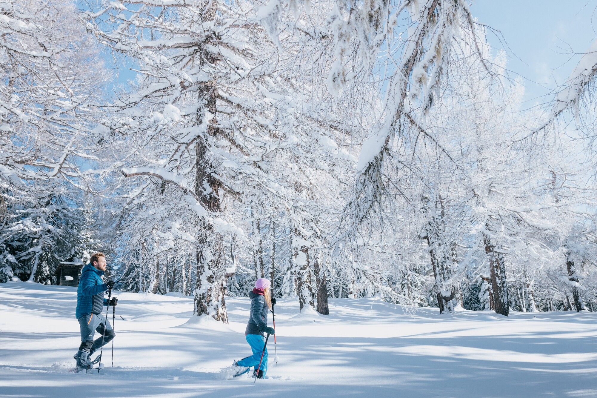 festes Schuhwerk, Schneeschuhe, Wanderstöcke, Getränk, der Witterung angepasste Kleidung