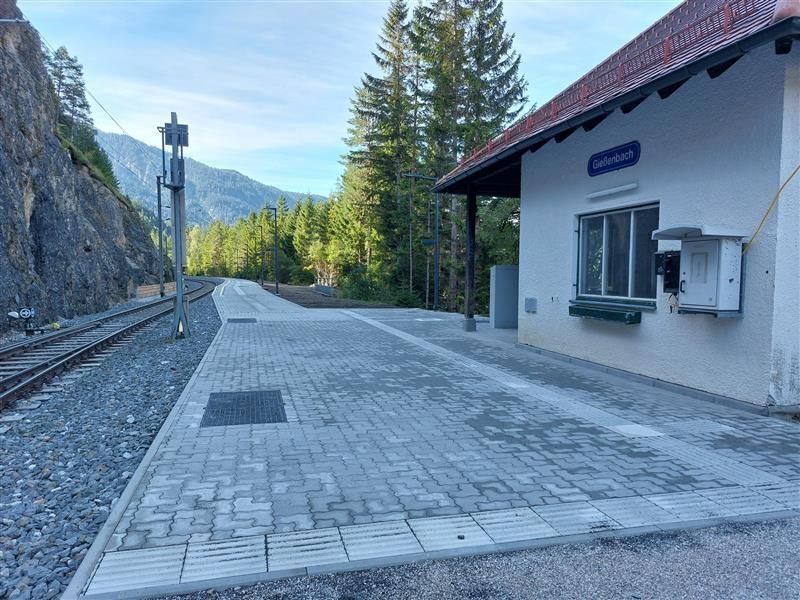 Die Bahnhaltestelle Gießenbach bietet Anschluss an regionale Verkehrsverbindungen und ist ein Bedarfshalt, das heißt, Züge halten hier nur bei Bedarf. Der barrierefreie Zustieg von den Bahnsteigen in die Züge ist gewährleistet. Die Bahnsteigoberflächen sind mit taktilen Leitsystemen ausgestattet, Wegeleitung und Beschilderung sind vorhanden, und die Monitore für die Zugankündigung sind barrierefrei in einer Höhe von maximal 160 cm.