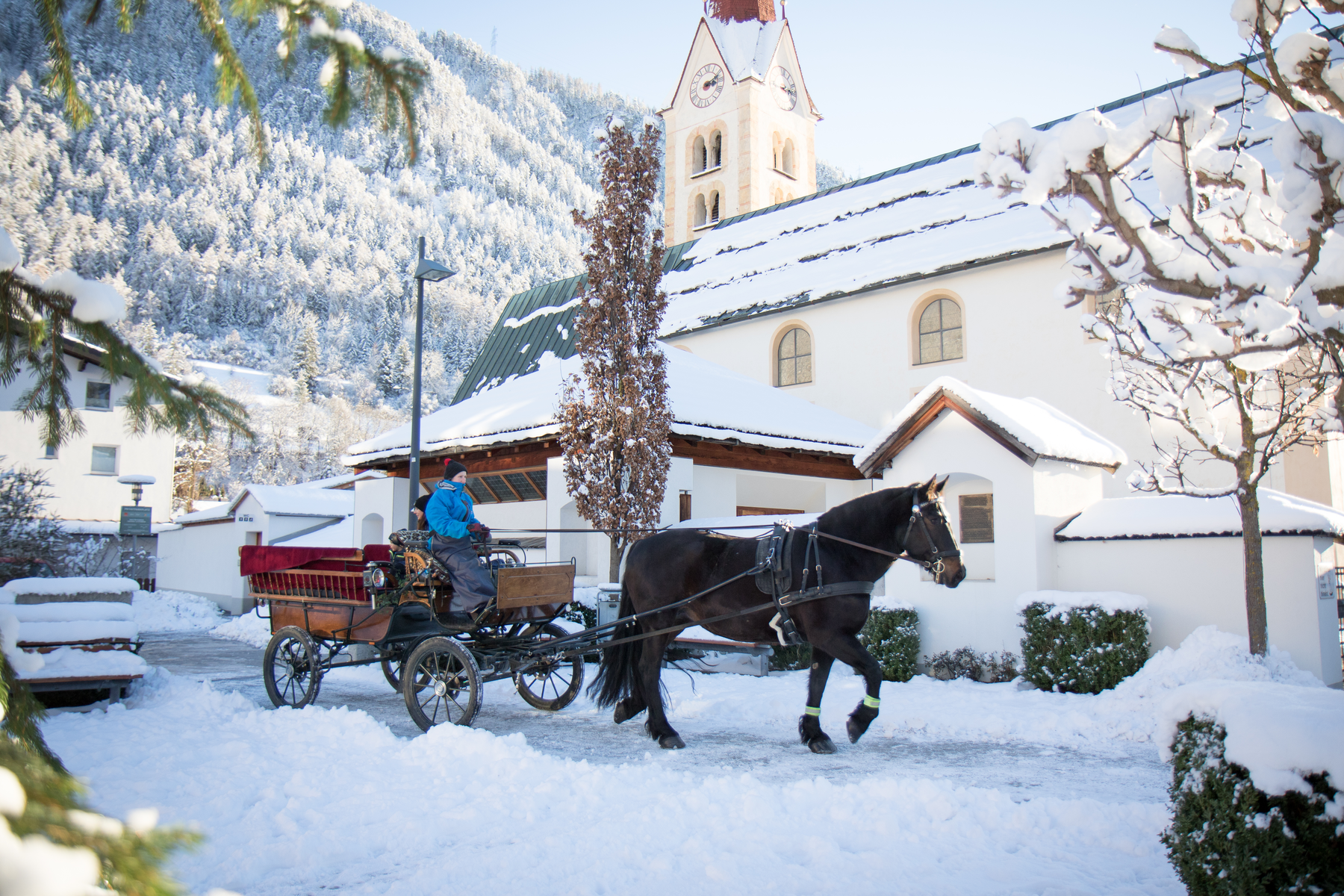Eingekuschelt in warme Decken sitzen Sie in der Pferdekutsche und genießen die vorbeiziehende Winterlandschaft. Jederzeit auf Anfrage bei Familie Köhle möglich.