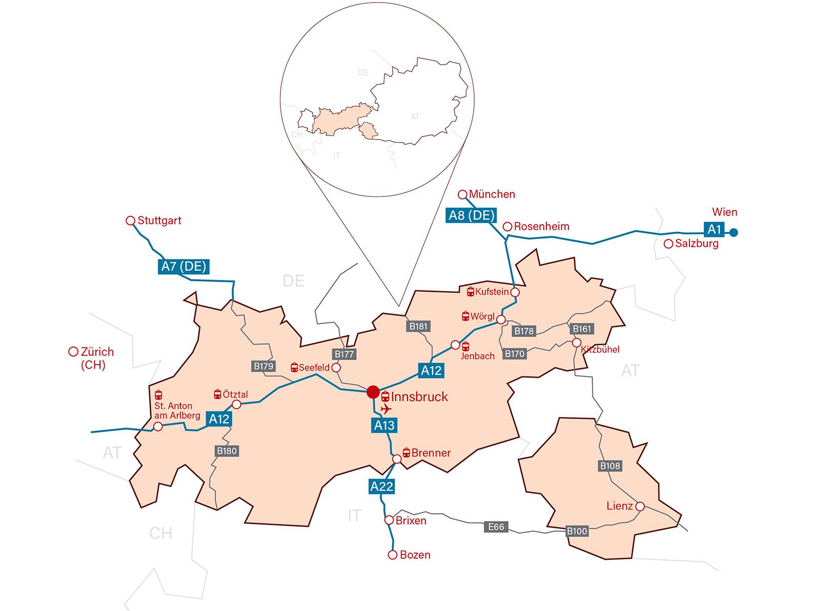 Die Anreise nach Tirol ist auf verschiedenen Wegen möglich. Mit der Bahn und nahtlosen Nahverkehrsverbindungen ist eine bequeme Anreise in alle Täler und direkt zur Unterkunft möglich. Auch Fernbusse bieten eine komfortable und umweltfreundliche Möglichkeit, Tirol zu erreichen. Alternativ kann Tirol über gut ausgebaute Autobahnen mit dem Auto erreicht werden, und der Flughafen Innsbruck verbindet Tirol mit internationalen Zielen.