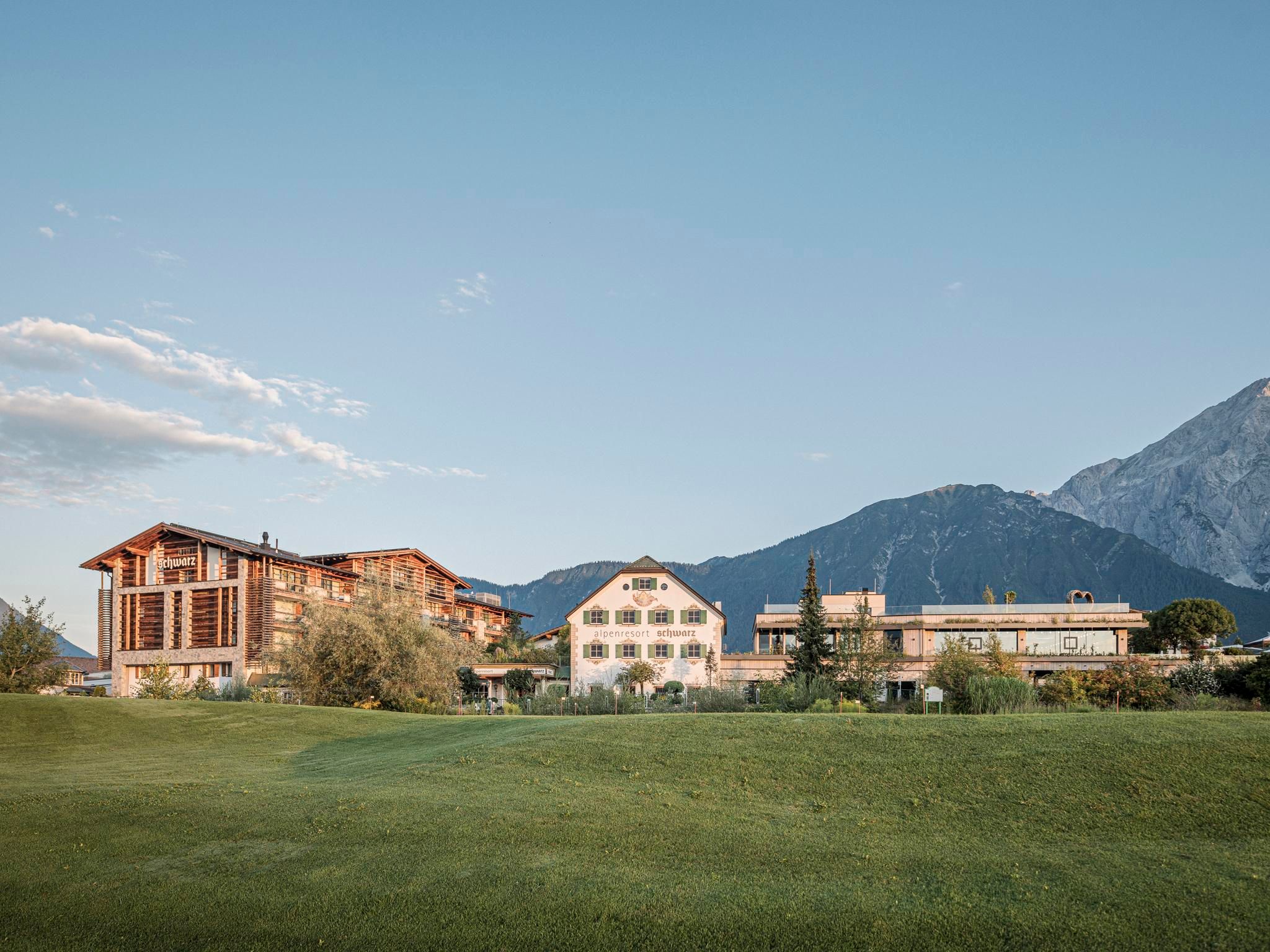 Nur 35 Kilometer westlich von Innsbruck, eingebettet in die beeindruckende Naturkulisse des Mieminger Plateaus, liegt das familiengeführte Alpenresort Schwarz.Ob Wandern, Golfen oder Biken – das weitläufige Sonnenplateau lädt ganzjährig zu vielfältigen Outdoor-Aktivitäten ein. Direkt am 27-Loch-Golfplatz gelegen und umgeben von einem atemberaubenden Bergpanorama, bietet das Resort ein abwechslungsreiches Bewegungsangebot für alle Altersgruppen. Das neue Bliss House mit Fitness Club und Sport Center, innovativer Ausstattung und einem erstklassigen Kursprogramm ist ein echtes Highlight für Aktivurlauber.Spa- und GesundheitsangebotGesundheit – und vor allem Gesunderhaltung – sind zentrale Elemente der Philosophie unseres 5.500 m² großen Me Holistic Spa.Das Herzstück der Wellnessoase ist die Schwarz Wasserwelt mit neun Pools, indoor und outdoor, verteilt auf zwei lichtdurchflutete Poolhäuser sowie das idyllische Gartenparadies. Damit alle Generationen voll auf ihre Kosten kommen, sind die Wasserwelten in Ruhepools und Family Pools unterteilt. Der 1.100 m² große Naturbadeteich vereint auf perfekte Weise Naturerlebnis und Badevergnügen. Highlight der Wasserwelt ist der 25-Meter-Infinity-Pool.Das großzügige Saunadorf besticht durch den traumhaften Garten und das beeindruckende Bergpanorama – ein Saunaerlebnis mitten in der Natur. Ein Warmwasserpool, ein Bergsee zum Schwimmen und ein Reflexzonenpfad ergänzen das umfangreiche Angebot an Saunen, Wärmekabinen und Ruheräumen.Medizinische Expertise bietet ein erfahrenes Ärztinnen-Trio – Dr. Heidi Pirktl, Dr. Irene Brunhuber und Dr. Julia Cordin – mit umfassenden Gesundheitspaketen und personalisierten Einzelbehandlungen.Ein Haus für alle GenerationenDas Alpenresort Schwarz ist ein Ort für alle Generationen. Familien profitieren von liebevoller Ganztages-Kinderbetreuung ab drei Jahren, einem abwechslungsreichen Jugendprogramm und maßgeschneiderten Angeboten für jede Altersgruppe. Highlights sind der Streichelzoo, die 92-Meter-Wasserrutsche sowie die Kletterwand. Erwachsene finden Erholung in den großzügigen Spa-Welten, beim Golfen oder bei kulinarischen Erlebnissen auf höchstem Niveau.Kulinarische VielfaltNeben dem Restaurant Genusswelt erwartet die Gäste ein vielfältiges kulinarisches Angebot:Restaurant 141 by Joachim Jaud | Ausgezeichnet mit 2 Sternen im Guide Michelin, 4 Hauben von Gault&Millau, 98 Punkten bei Falstaff À-la-carte-Restaurant Greenvieh | Saftige Steaks vom Holzkohlegrill, raffinierte Bowls und saisonale Specials Stöttlalm | Die perfekte Location inmitten der Natur mit einzigartigem Panoramablick