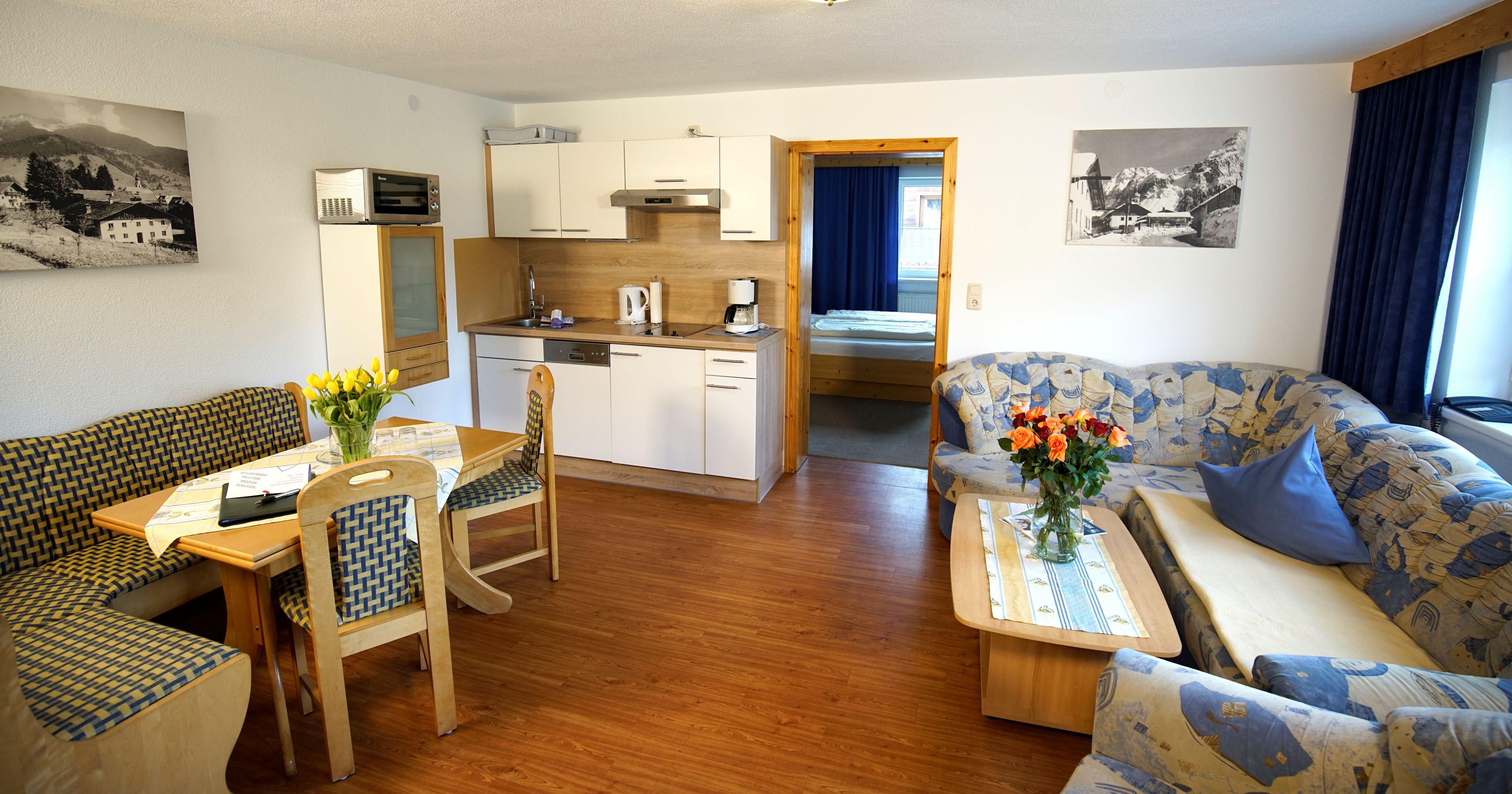 ALPENSTERN*** Pension - Fewo – Apart, Ihr Zuhause in der Tiroler Zugspitz Arena Lermoos. Ferienwohnungen, diese sind zwischen 45 und 90m² groß und bieten Platz für 2 bis 7 Personen. Jede Wohnung verfügt über Wohnraum, Schlafzimmer, Badezimmer und Kochbereich. Der Wohnbereich ist mit einer gemütlichen Sitzecke/Schlafsofa, TV und Radio ausgestattet. Der Kochbereich ist komplett ausgestattet (2-Plattenherd, Kühlschrank mit Gefrierfach, Mikrowelle, teilweise mit Geschirrspüler,...). Doppelzimmer, geräumige 26m² mit getrennter Dusche und WC.In den Schlafzimmern befindet sich ein Safe. Bettwäsche und Handtücher sind im Mietpreis inbegriffen. Auf unserer 360° Panoramaterrasse erleben Sie einen einzigartigen Blick auf Zugspitze und Co.