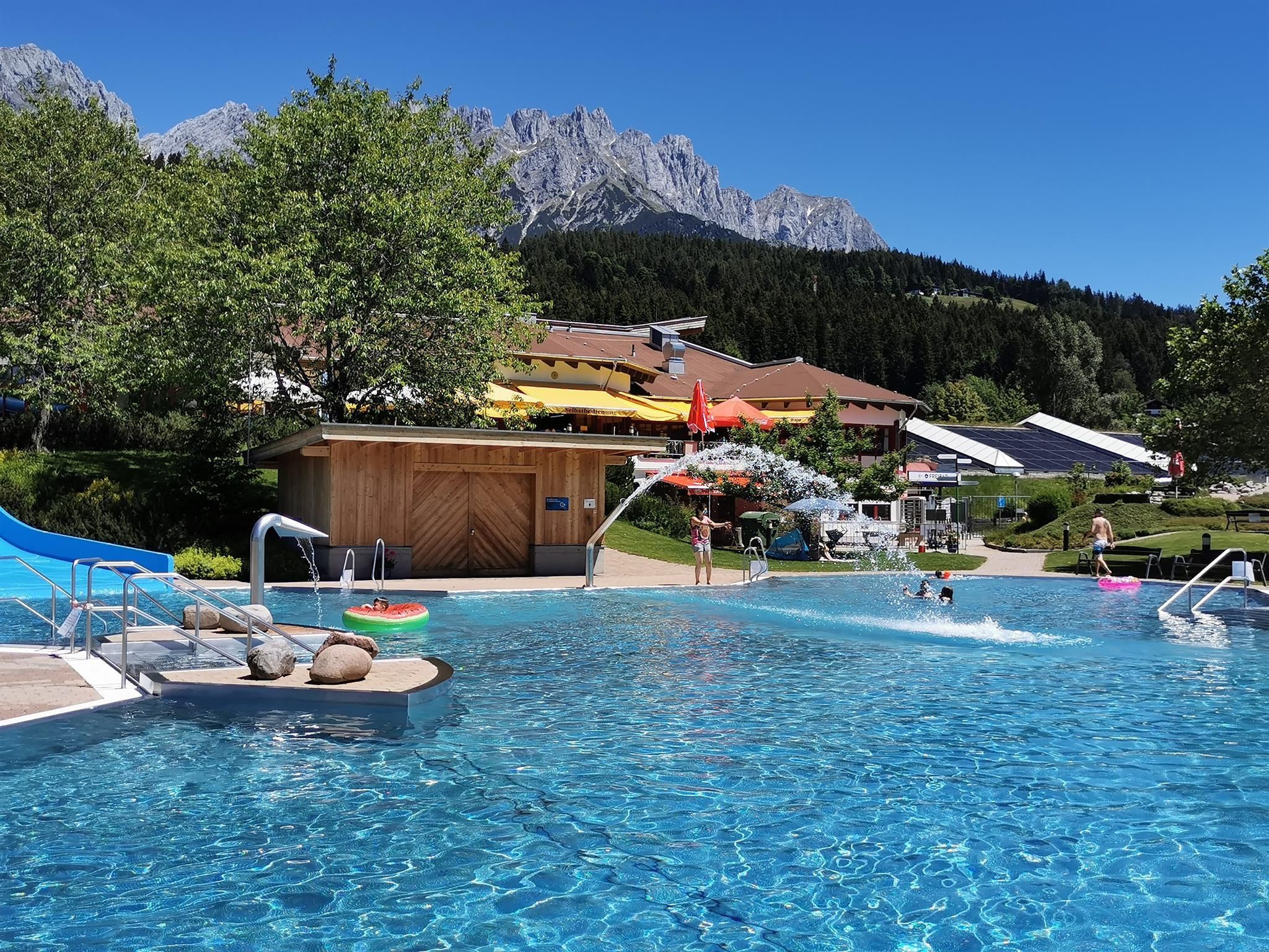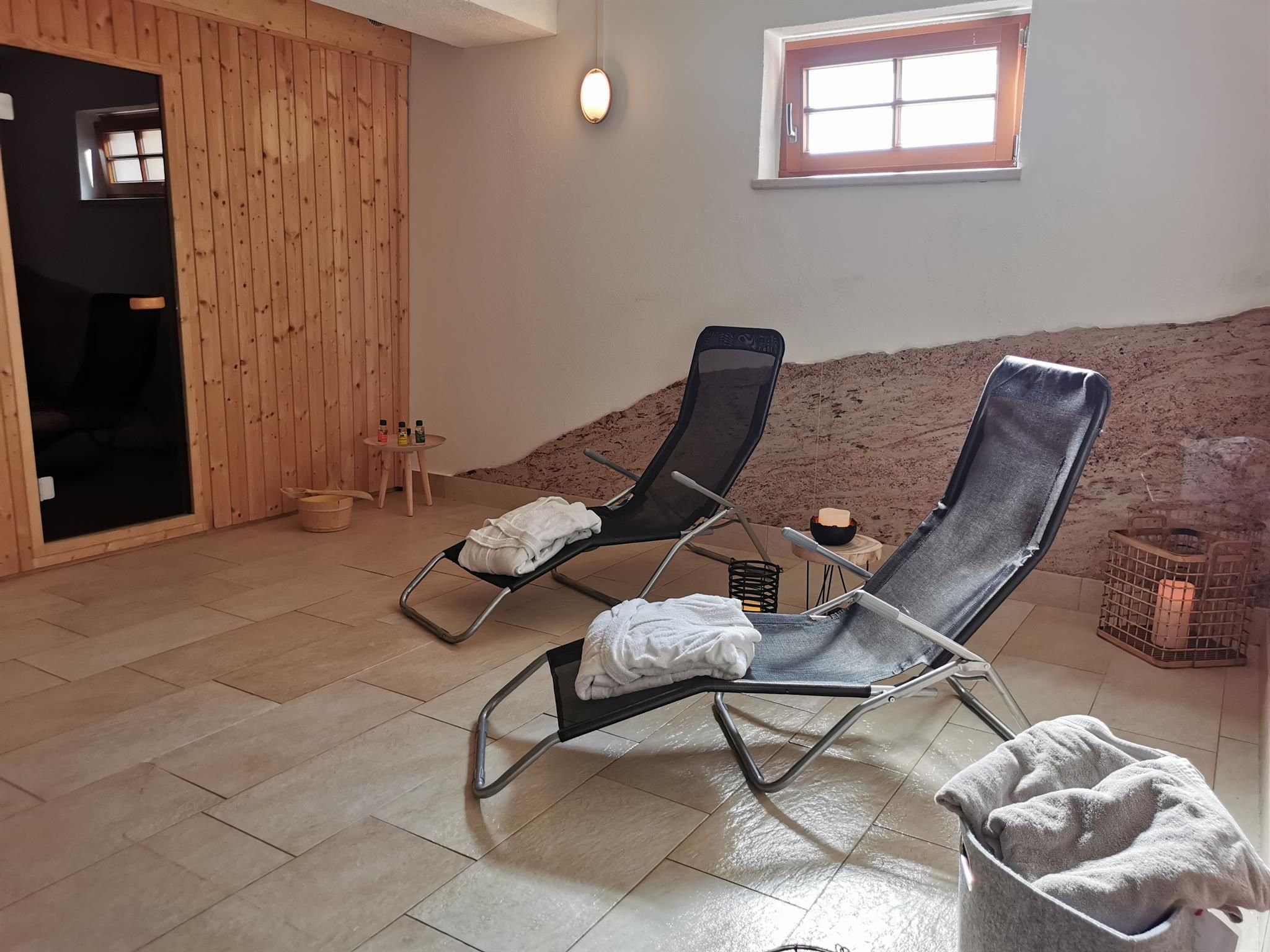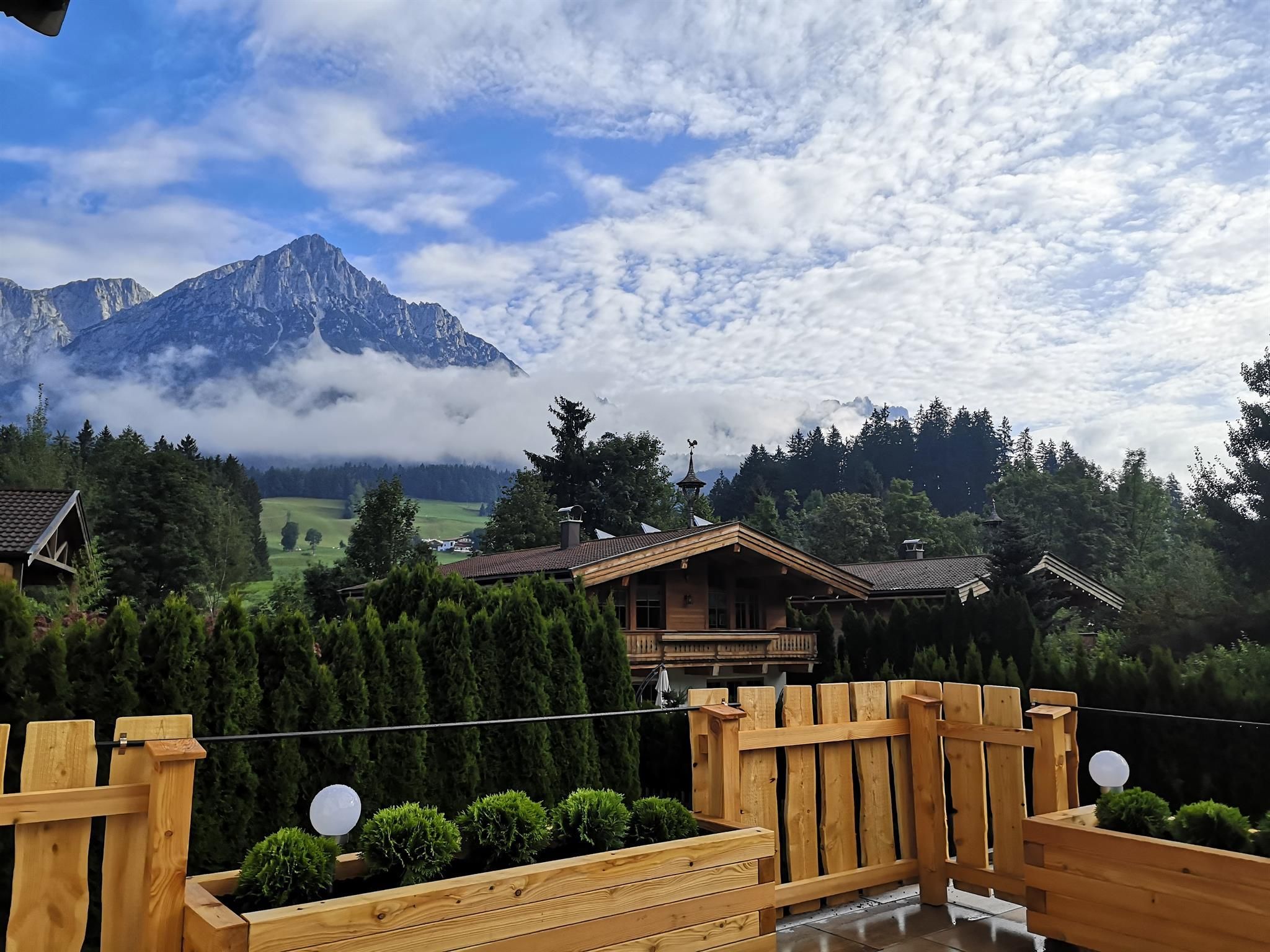 Unser Angebot für Sie: Unser Appartement Edelweiß wurde im Mai 2017 liebevoll renoviert und bietet Platz für bis zu 6 Personen. Jedes Jahr kommen kleinere oder größere Neuerungen dazu. 2019 wurde unsere tolle Ostterrasse mit Kaiserpanorama fertig gestellt.Im Herbst 2023 wurde das Bad komplett renoviert.In der großen, komplett ausgestatteten Wohn-Küche finden Sie: Geschirrspüler, Herd mit Ceranfeld und Backofen, Toaster, Nespresso-Kaffeemaschine, "normale" Kaffeemaschine, Wasserkocher, Gewürze, Zucker usw., sowie eine schöne Essecke. Im Wohnbereich gibt es eine gemütliche Couch, einen Fernseher mit Satelliten-TV und ein Radio. Auf den beiden Terrassen (Süd & Ost) können Sie mit einem traumhaften Blick auf den Wilden Kaiser die Seele baumeln lassen. Im Sommer steht Ihnen ein Weber Elektro-Grill zur Verfügung.Die Wohnung hat zwei getrennte Schlafzimmer jeweils mit Kaiserblick. In einem steht ein großes Doppelbett (180x200) und ein Einzelbett, welches zu einem Doppelbett (160x200) ausgezogen werden kann. Das zweite Schlafzimmer hat ein Stockbett mit einer großen Liegefläche unten (140x200) und einem normalen Bett oben und bietet Kindern genügend Platz zum Spielen. Beide Schlafzimmer bieten ausreichend Stauraum für Ihre Kleidung. Auf Wunsch stellen wir Ihnen gern kostenfrei Kinderbett/ Hochstuhl zur Verfügung. Das geräumige Badezimmer mit Wellness-Dusche und Doppelwaschtisch und viel Stauraum ist getrennt vom WC nutzbar und mit einem Föhn ausgestattet. WLAN, Handtücher (1 Set/ Person), Bettwäsche, Geschirrtücher, Seife, Spültaps, Spülmittel sind im Preis inklusive. Für Ihr Auto steht Ihnen ein Carport mit 2 Stellplätzen zur Verfügung Im Wellnessbereich gibt es eine finnische Sauna, eine Infrarotkabine und eine große Dusche. Ein kleiner Ruhebereich mit Liegen rundet das Wellnessvergnügen ab. Sollten Sie extra Bademäntel und Saunatücher hierfür benötigen, erhalten Sie die gegen einen kleinen Aufpreis im Set. Buchen Sie Ihren Traumurlaub! Wir freuen uns auf Sie!