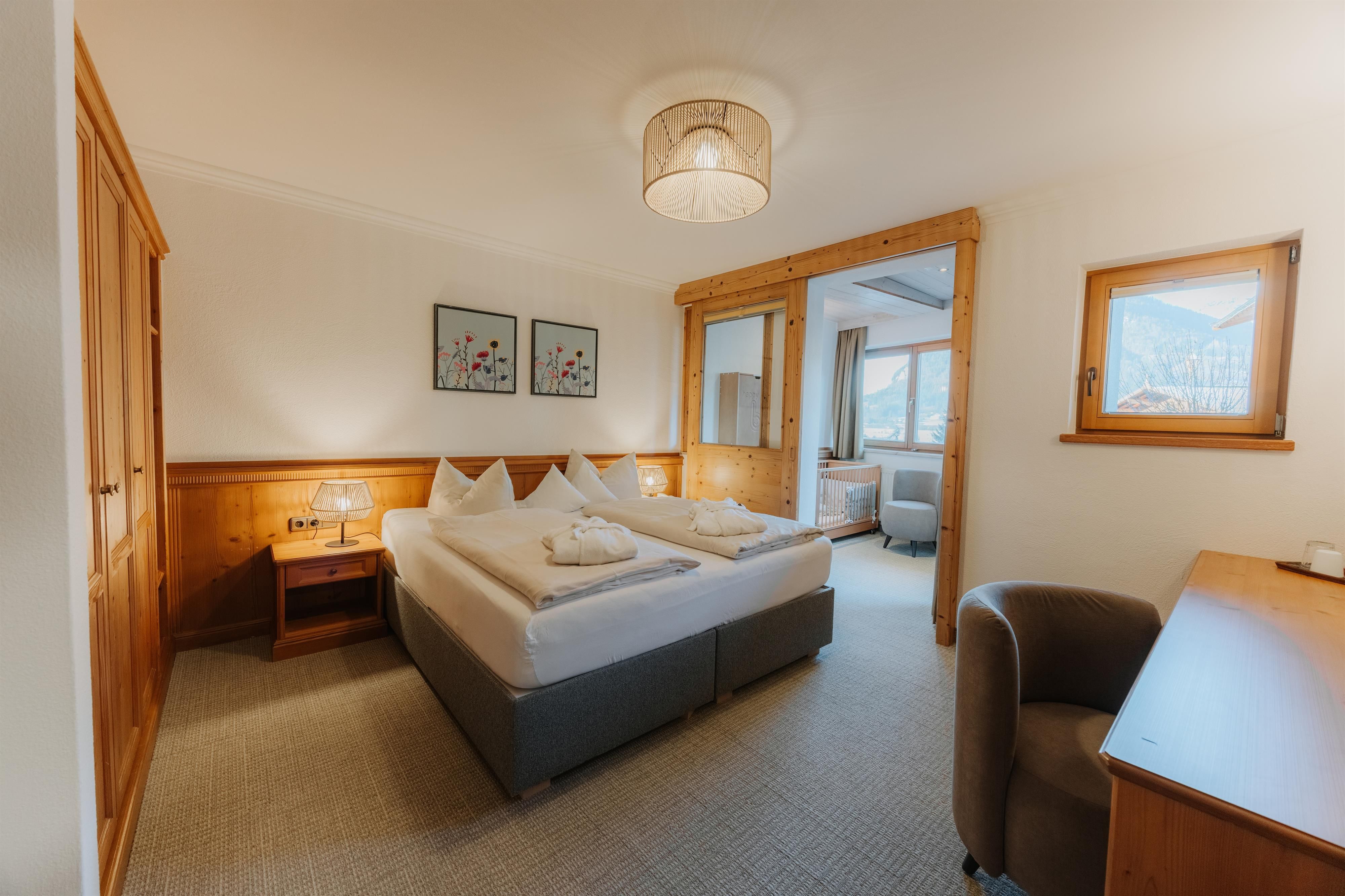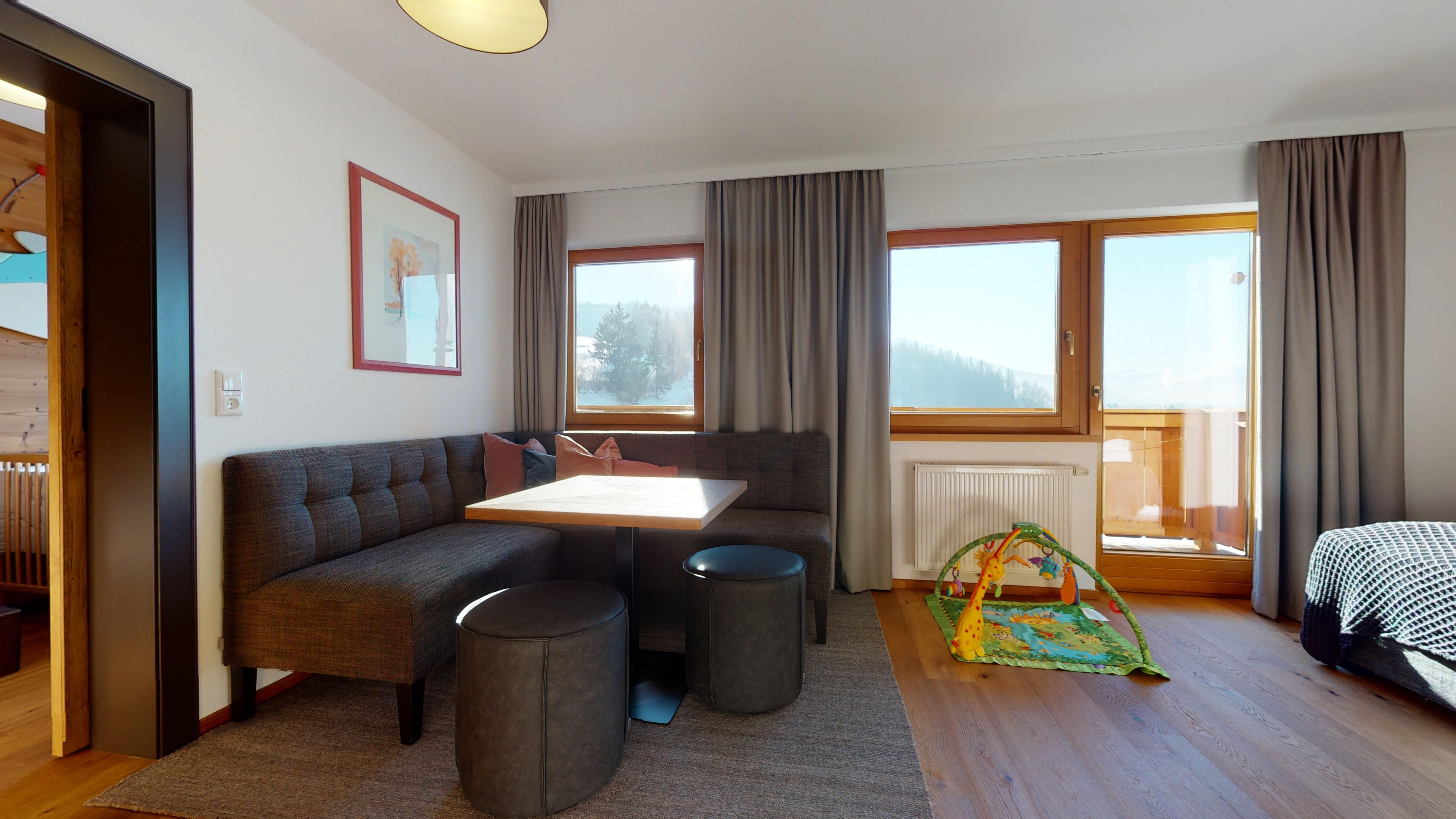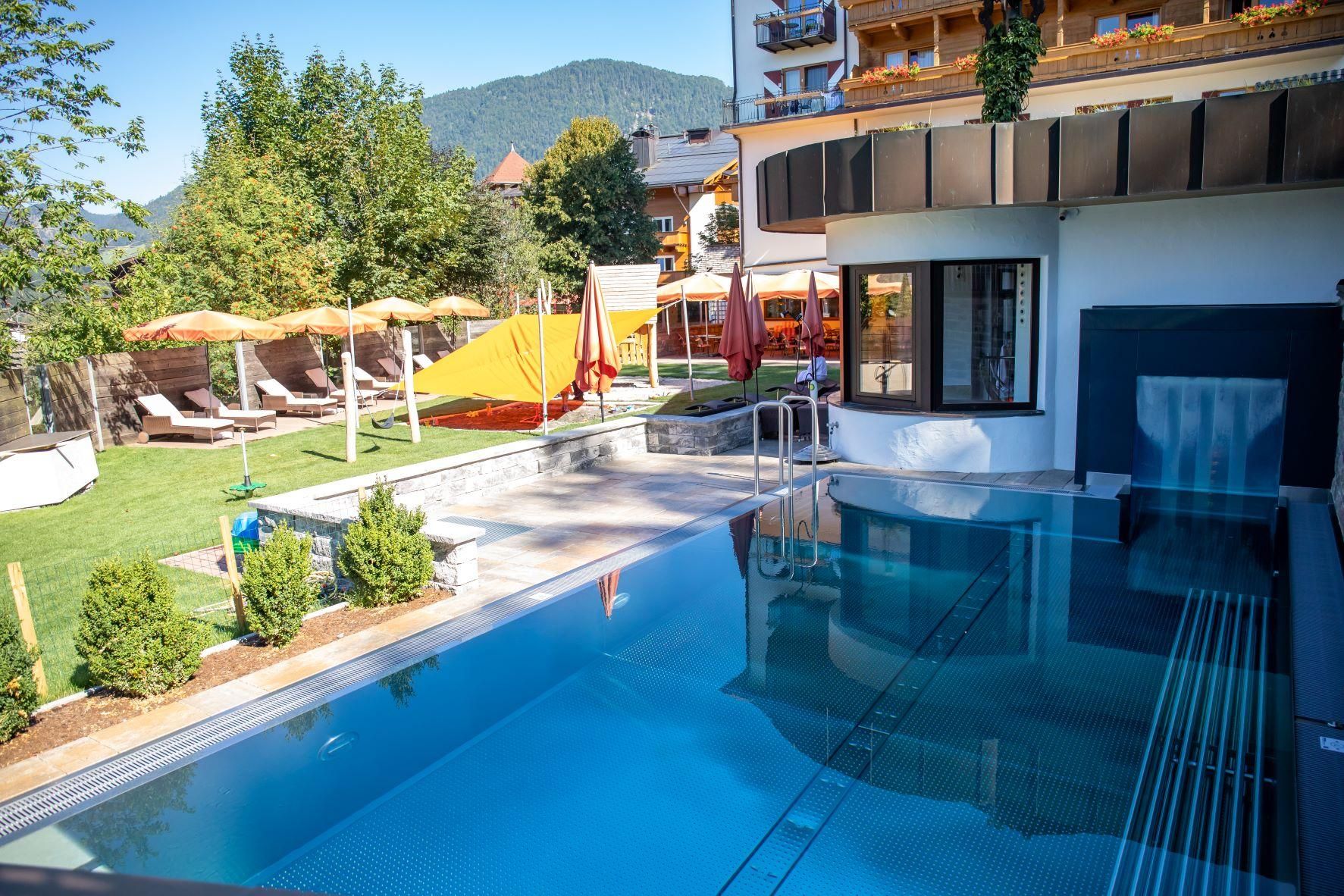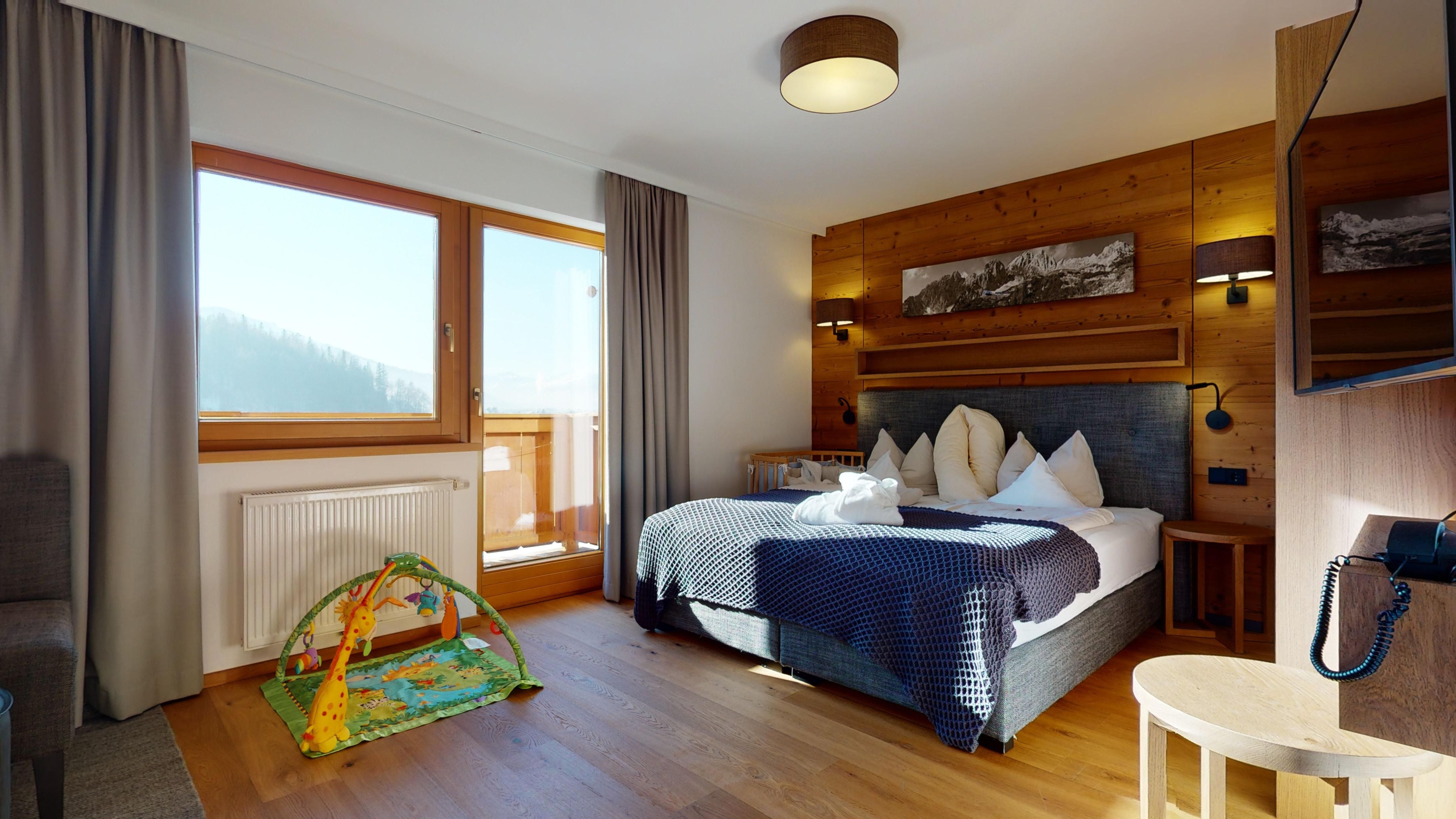 BABYHOTEL BABYMIO - KIRCHDORF IN TIROL "Traumhafter Familienurlaub mit kleinen Kindern im Babyhotel und Kinderhotel babymio! Hallenbad 32,5°C mit Kinderrutsche, Babybecken, Ausschwimmbecken für Sommer und Winter 33°C,1200 m² indoor Kinderwelt in 200m Entfernung! Im Kinderhotel babymio fühlen sich junge Familien mit Baby und Kleinkinder besonder wohl. Damit schon Ihre Anreise entspannt beginnen kann, finden Sie bei uns die komplette Baby- und Kleinkind- Ausstattung vor Ort, vom Kinderwagen über Babybett und Wickeltisch bis hin zur altersgerechten Spielekiste. In der Baby- und Kinderbetreuung werden die Kleinen liebevoll von unserem professionellen Team betreut. Täglich gibt es interessante Programme wie Baby- und Kinderschwimmen, Babymassage, Papa- Babywanderung und das alles inklusive! Mama und Papa können gemeinsam Wandern, Radfahren, Skifahren, oder Wellness genießen, während der kleine Spatz betreut wird - oder Sie genießen all dies gemeinsam im Familienhotel babymio.