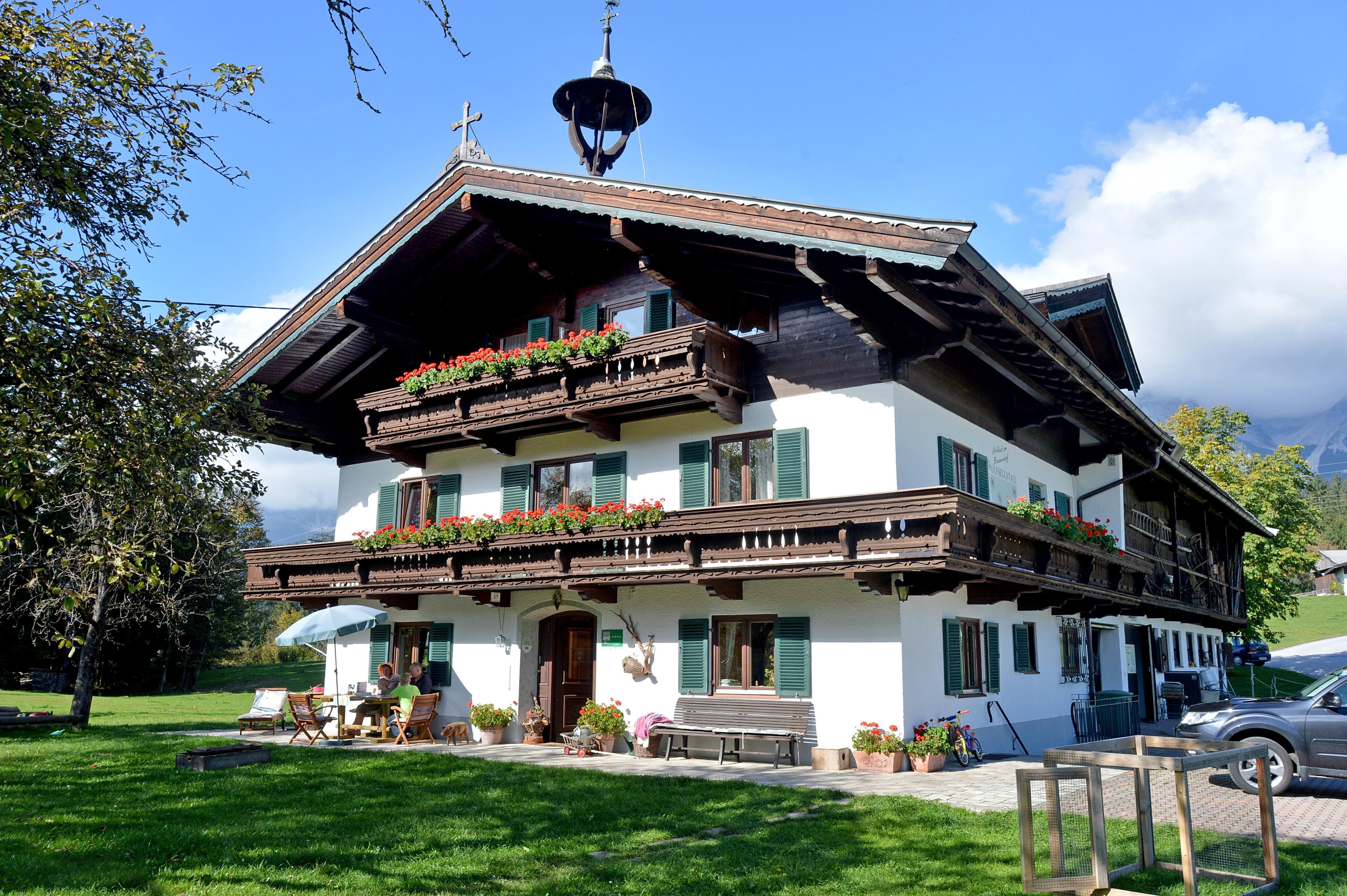 Willkommen auf unserem Biobauernhof Wolfseggstall und Pension Sunnbichl! Genießen Sie die Aussicht von dem sonnigen „Sunnbichl“ in vollen Zügen, sowie die ruhige Lage. Dabei sehen Sie vom Wilden Kaiser bis zu den Kitzbüheler Alpen die gesamte Bergwelt. Unser Haus verfügt über eine Erlebnissauna sowie eine Infrarotkabine, die Ihnen zur Erholung kostenlos bereit steht. Begrüßen Sie den Tag auf unserer großzügigen Sonnenterrasse mit einem köstlichen Bauernhoffrühstück. Am Abend gibt es die Möglichkeit (ab 10 Bestellungen) für Erwachsene € 18,-- und Kinder € 12,-- ein Abendessen das vom Chef Georg persönlich mit viel Liebe und natürlich aus hofeigenen Produkten zubereitet wird, zu genießen. Für unsere kleinen Gäste ist es immer wieder etwas Besonderes, wenn Sie mit Pony Flori spazieren gehen oder die anderen Hofbewohner wie Hasen, Schweine, Hühner und Katzen kennenlernen dürfen. Ein Highlight des Urlaubs ist der Indianergrill, die Spielhütte im Wald und wer sich traut, hat auch die Möglichkeit im Heu zu übernachten!