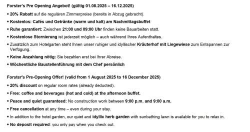 Entdecken Sie einen idyllischen Rückzugsort inmitten malerischer Landschaften und genießen Sie exklusiven Komfort, zahlreiche Freizeitaktivitäten sowie erstklassige Annehmlichkeiten. Die eleganten Nichtraucherzimmer, größtenteils mit Holzböden, werden in verschiedenen Größen zur Auswahl angeboten. Der luxuriöse Wellnessbereich bietet 6 Saunen, Innen- und Außenpools sowie eine Sonnenterrasse mit bequemen Liegestühlen. Lassen Sie sich mit professionellen Massagen und Schönheitsanwendungen verwöhnen. Genießen Sie das abwechslungsreiche Frühstücksbuffet, köstliche Snacks am Nachmittag und 5-Gänge-Menüs am Abend im Restaurant. Entspannen Sie in der gemütlichen Hotelbar und erleben Sie die familienfreundliche Atmosphäre, zu der ein Spielzimmer im Innenbereich und ein großer Abenteuerspielplatz im Freien beitragen. Forster's Naturresort ist ein idealer Ausgangspunkt für Wanderungen, Ski- und Fahrradtouren. Freuen Sie sich auf kostenlose Leihfahrräder und die Stubai Super Card für die Sehenswürdigkeiten in der Region. Entdecken Sie Naturerlebnisse wie Kräuterworkshops oder ein Waldbad und genießen Sie unvergessliche Momente. Sie profitieren hier von Parkplätzen, Ladestationen für Elektrofahrzeuge und einer nur 50 m entfernten Bushaltestelle, von der Sie bequem die Gegend vom Stubaier Gletscher bis nach Innsbruck erkunden können. Mit Forster's Naturresort erwartet Sie der perfekte Ort für Entspannung und Erholung. Das Zentrum von Neustift befindet sich 1,5 km entfernt. Eine Skibushaltestelle erreichen Sie schon nach etwa 100 m. Das Skigebiet Stubaier Gletscher ist 20 km entfernt und das Skigebiet Elferlifte 2,1 km.