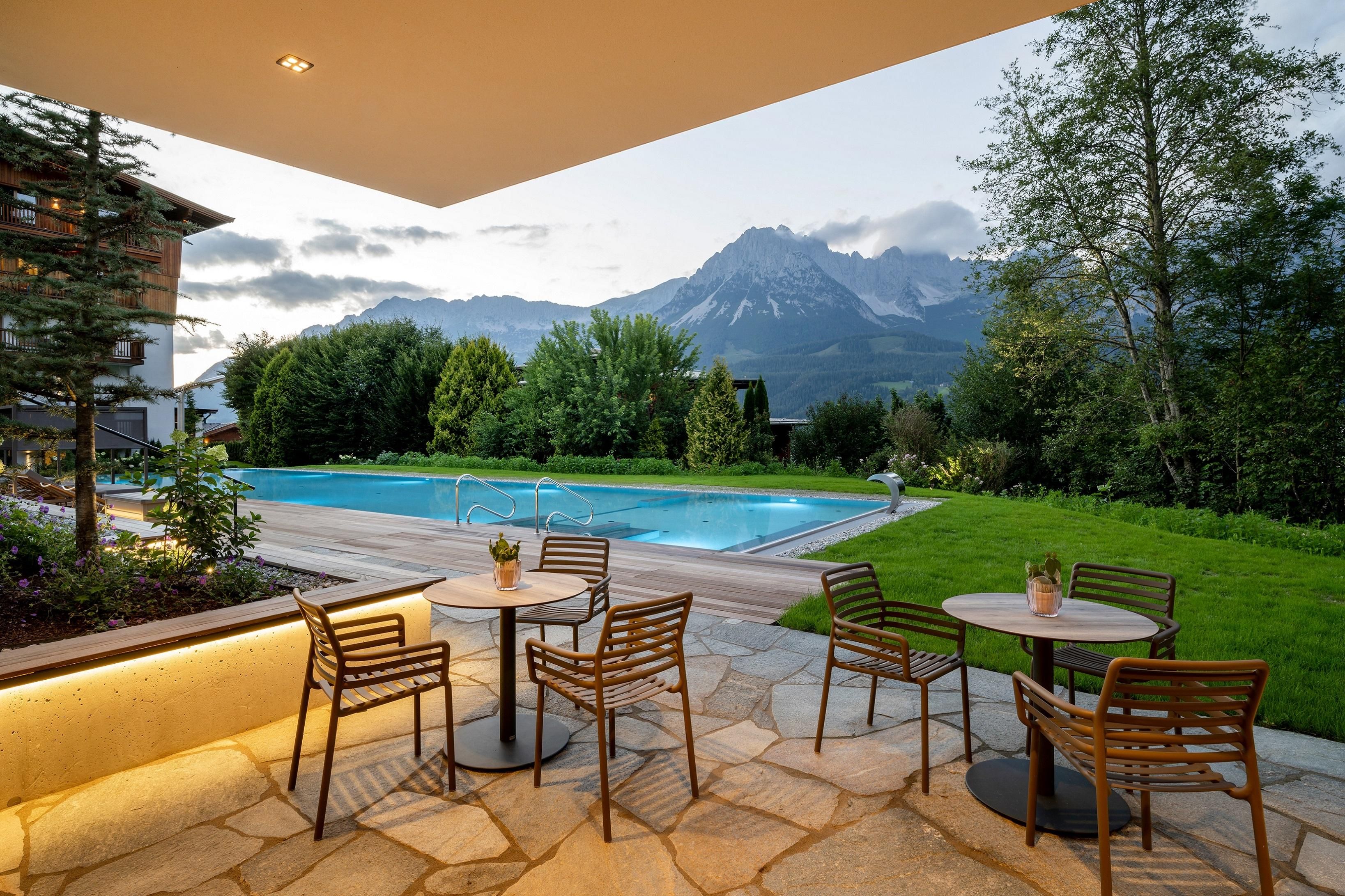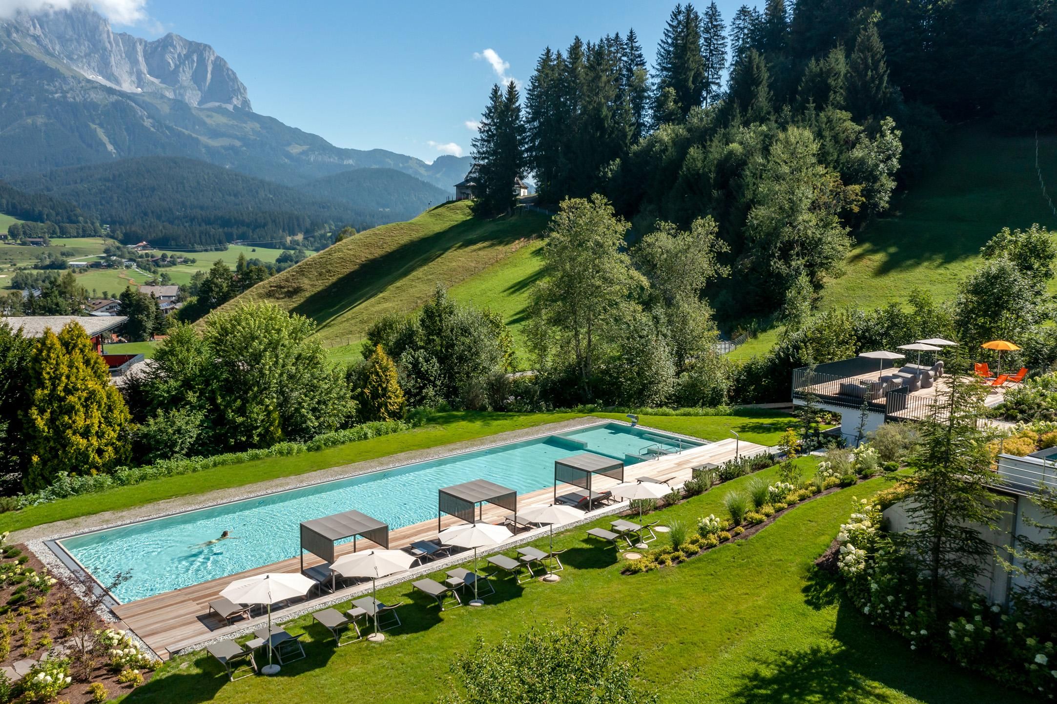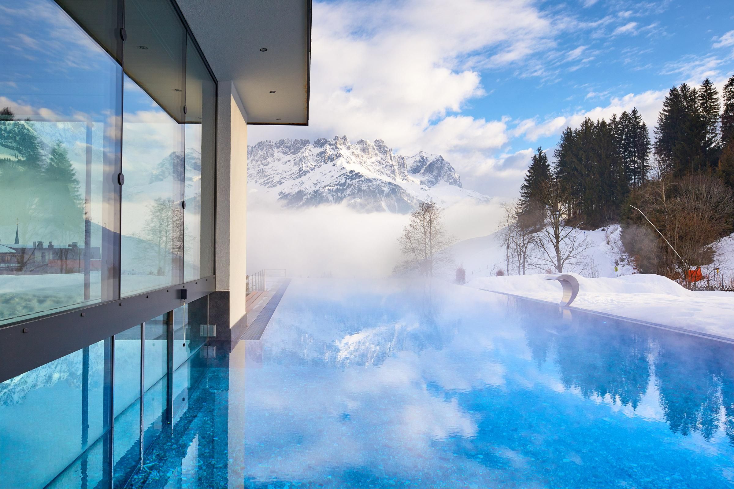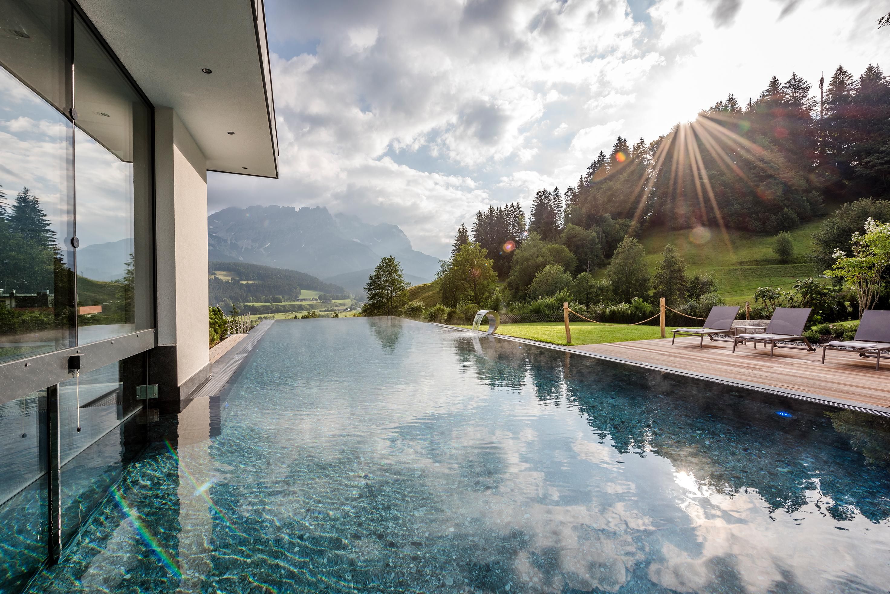 Ein Ort zum Verlieben. In dem von Familie Windisch sehr sorgsam und herzlich geführten, weitläufigen Urlaubsdomizil am Fuße des Wilden Kaisers in Tirol lässt sich das Leben genießen. Das Haupthaus bietet mit geräumigen Doppelzimmern und elegant-luxuriösen Suiten jedem Gast individuelle Räumlichkeiten.Urlaub mit allen SinnenDas Gourmetrestaurant im Hotel DER BÄR - prämiert von Falstaff - serviert regionale sowie internationale Kreationen in gewohnter Spitzenqualität. Sehr wohl fühlt man sich auch an der modernen Hotelbar, wo edle Tropfen und feine Drinks den Abend perfekt ausklingen lassen. Bäriger geht’s nicht. Genuss auf hohem NiveauDer 20 m lange, ganzjährig mit 31° C beheizte Infinity-Pool verspricht grenzenlose Erholung vor Traumkulisse – ist aber „nur“ ein Highlight von vielen! Denn das gesamte Badehaus mit Hallenbad, Saunalandschaft, Ruheraum mit grandiosen Panoramafenstern raubt Genießern den Atem. Ob drinnen oder draußen – hier wird man immer mit einem einmaligen Ausblick auf den Wilden Kaiser belohnt. Auch in den Zimmern und Suiten, die alpinen Charme mit modernem Chic gekonnt kombinieren, gehört der majestätische Berg sozusagen zum Interieur. Und die herrliche Natur der Kitzbüheler Alpen, diese kaiserliche Landschaft, ist zu jeder Jahreszeit ein wunderbarer Ort, um neue Kraft und Energie zu tanken. Im Sommer erhalten Golfer am nahe gelegenen Golfplatz Wilder Kaiser/Ellmau 30% auf Ihr Greenfee und im Winter erleben Wintersportler in der SkiWelt Wilder Kaiser/Brixental auf 279 Pistenkilometern die neue Dimension des Skifahrens. Für die Kleinen haben wir einen Miniclub, großzügig und hell, gleich neben dem Garten.Die etwas Größeren sind im Chillraum unter sich.Wie gut sich das alles anfühlt? Erleben Sie es bitte selbst. Wir erwarten Sie in gewohnter Atmosphäre großer Herzlichkeit.