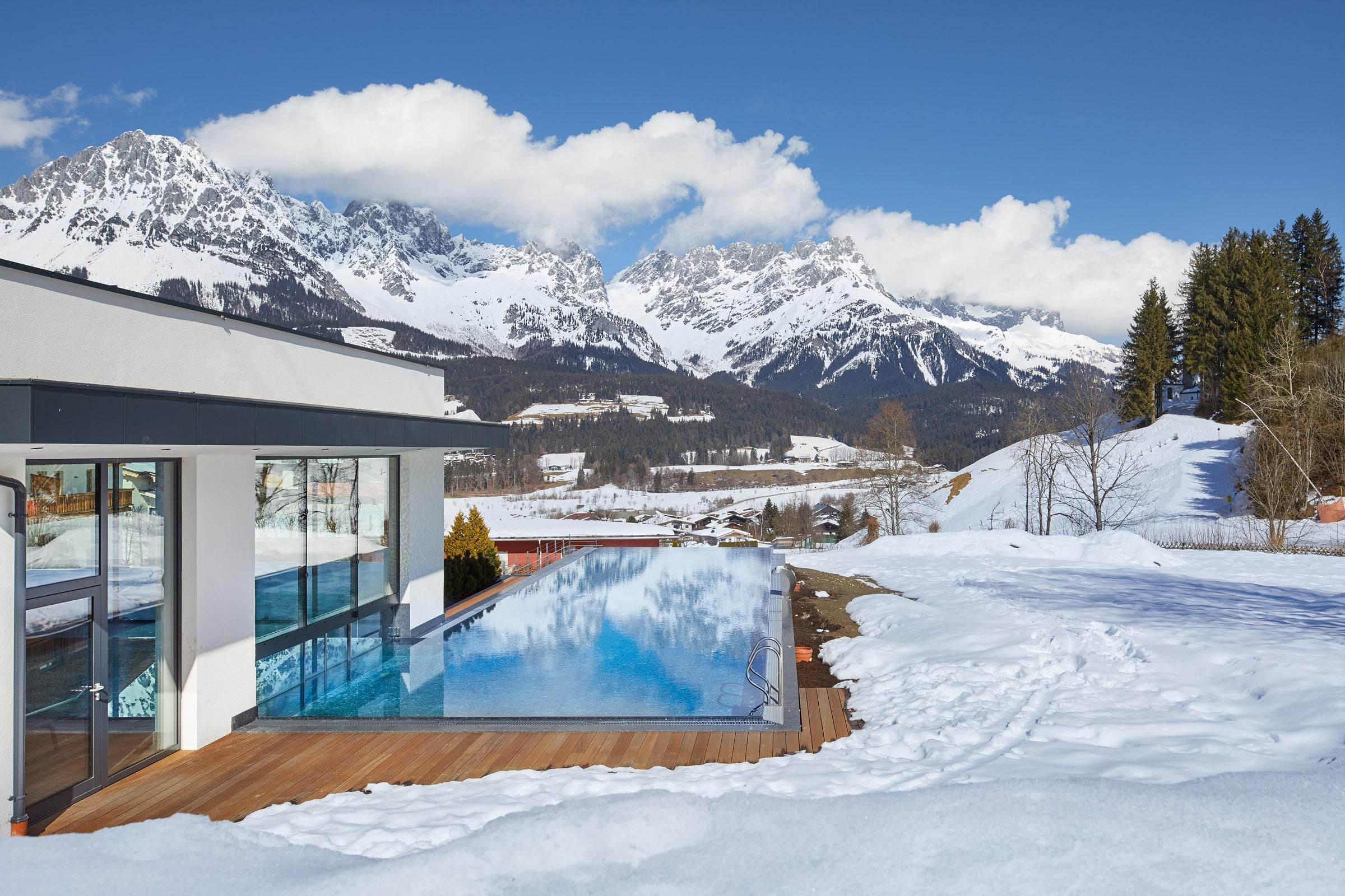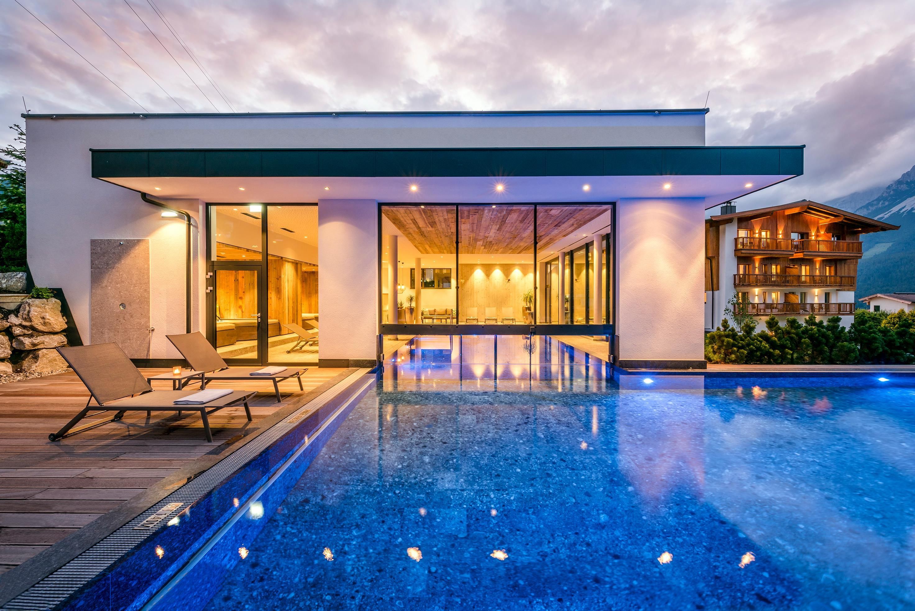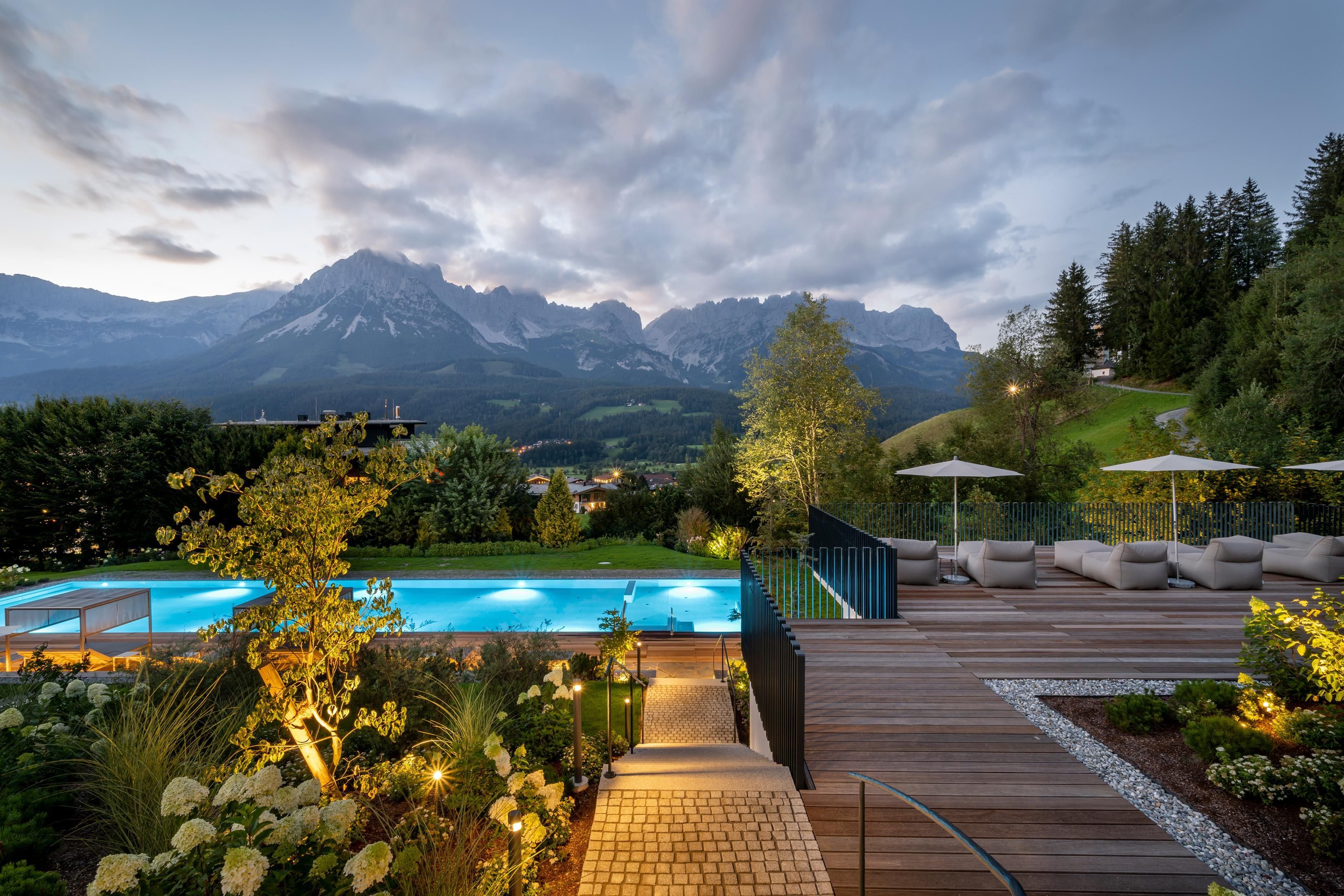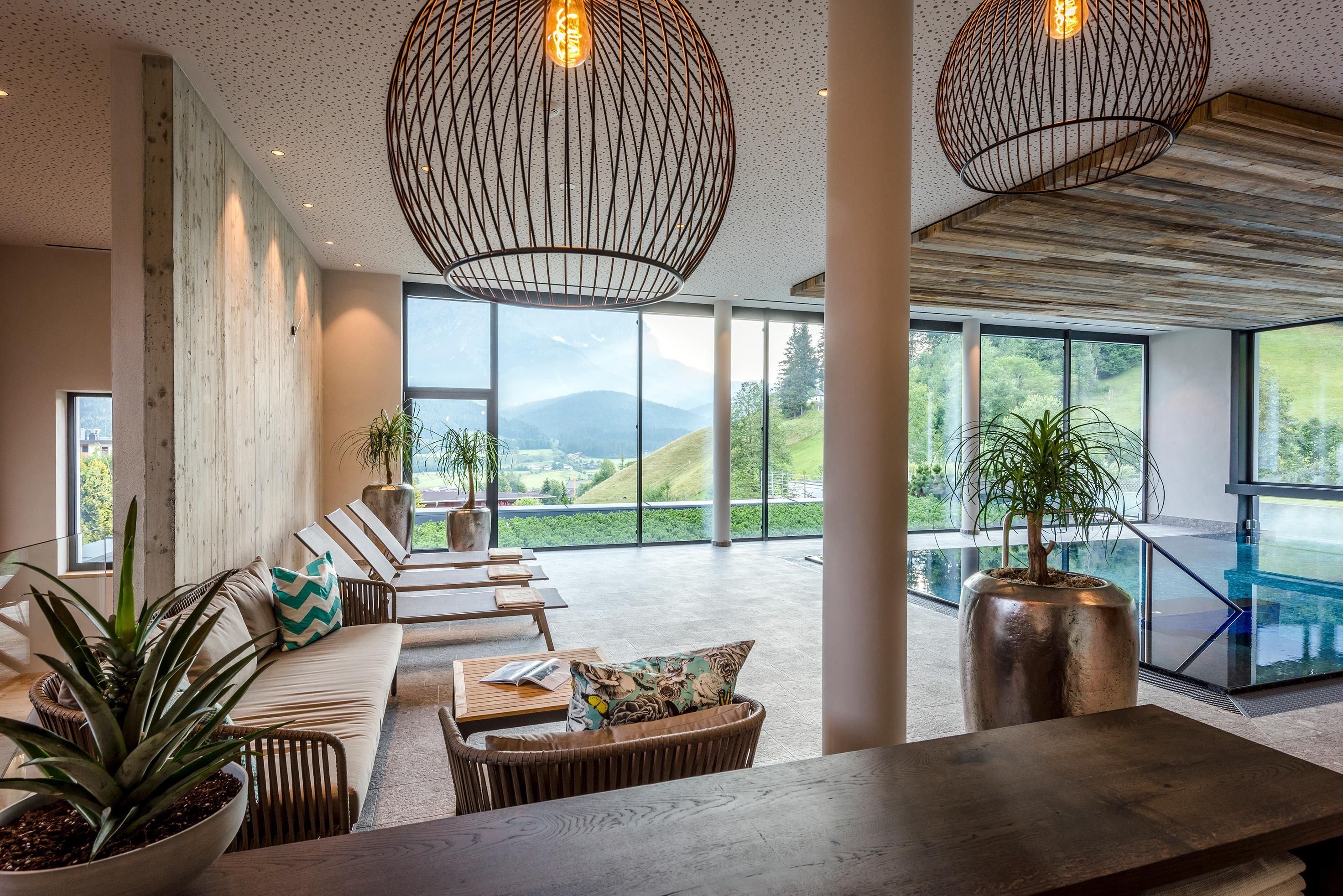 Ein Ort zum Verlieben. In dem von Familie Windisch sehr sorgsam und herzlich geführten, weitläufigen Urlaubsdomizil am Fuße des Wilden Kaisers in Tirol lässt sich das Leben genießen. Das Haupthaus bietet mit geräumigen Doppelzimmern und elegant-luxuriösen Suiten jedem Gast individuelle Räumlichkeiten.Urlaub mit allen SinnenDas Gourmetrestaurant im Hotel DER BÄR - prämiert von Falstaff - serviert regionale sowie internationale Kreationen in gewohnter Spitzenqualität. Sehr wohl fühlt man sich auch an der modernen Hotelbar, wo edle Tropfen und feine Drinks den Abend perfekt ausklingen lassen. Bäriger geht’s nicht. Genuss auf hohem NiveauDer 20 m lange, ganzjährig mit 31° C beheizte Infinity-Pool verspricht grenzenlose Erholung vor Traumkulisse – ist aber „nur“ ein Highlight von vielen! Denn das gesamte Badehaus mit Hallenbad, Saunalandschaft, Ruheraum mit grandiosen Panoramafenstern raubt Genießern den Atem. Ob drinnen oder draußen – hier wird man immer mit einem einmaligen Ausblick auf den Wilden Kaiser belohnt. Auch in den Zimmern und Suiten, die alpinen Charme mit modernem Chic gekonnt kombinieren, gehört der majestätische Berg sozusagen zum Interieur. Und die herrliche Natur der Kitzbüheler Alpen, diese kaiserliche Landschaft, ist zu jeder Jahreszeit ein wunderbarer Ort, um neue Kraft und Energie zu tanken. Im Sommer erhalten Golfer am nahe gelegenen Golfplatz Wilder Kaiser/Ellmau 30% auf Ihr Greenfee und im Winter erleben Wintersportler in der SkiWelt Wilder Kaiser/Brixental auf 279 Pistenkilometern die neue Dimension des Skifahrens. Für die Kleinen haben wir einen Miniclub, großzügig und hell, gleich neben dem Garten.Die etwas Größeren sind im Chillraum unter sich.Wie gut sich das alles anfühlt? Erleben Sie es bitte selbst. Wir erwarten Sie in gewohnter Atmosphäre großer Herzlichkeit.