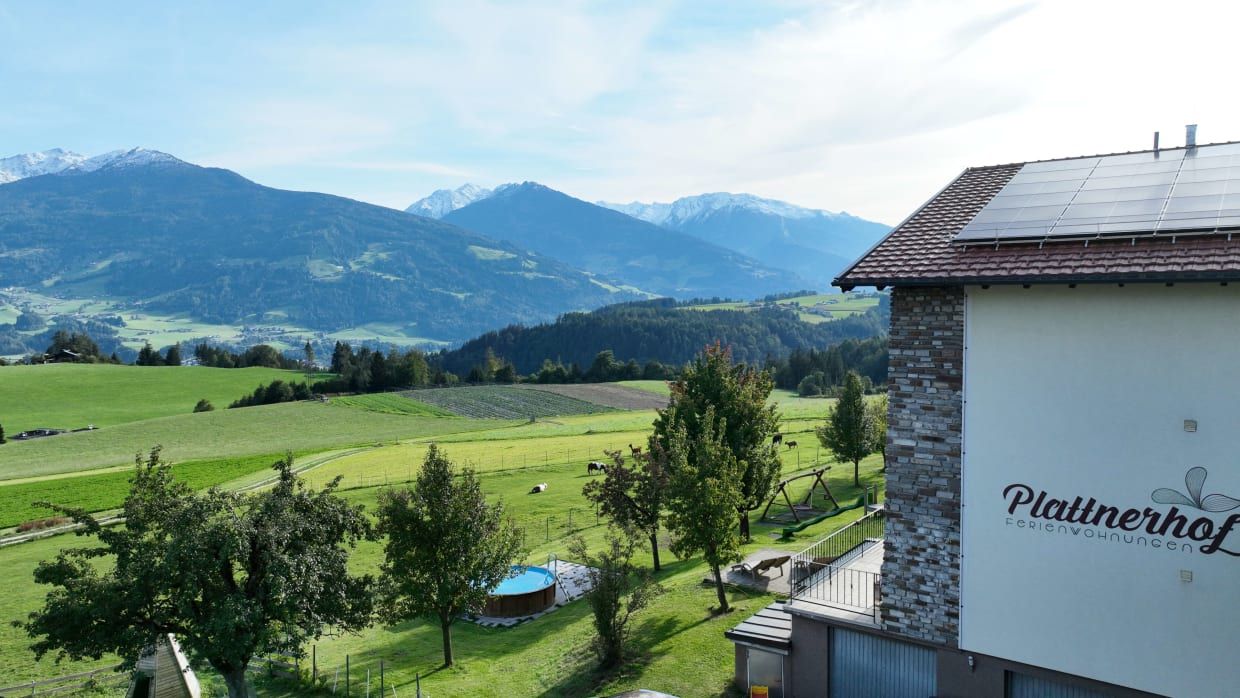 Der Plattnerhof liegt auf einem Sonnenplateau am Umlberg in Terfens/Tirol mit ca. 100 Einwohnern - 25 km von der Landeshauptstadt Innsbruck entfernt. Der Bauernhof ist 3 km vom Dorfzentrum entfernt, wo es ein Geschäft, ein Café, den Gasthof "Waldhof" und den Badesee "Weißlahn" mit Tennis- und Volleyballplatz gibt. Die unmittelbare Waldnähe ermöglicht einen guten Ausgangspunkt für viele verschiedene Spaziergänge zum Beispiel zur "Ganalm" und zur "Hinterhornalm". In unserem Ferienhaus finden sich 6 Wohnungen! Auf unserem Hof halten wir viele Tiere: Kühe, Kälber, Hühner, indische Laufenten, Hasen, 3 Ponys und viele Katzen, Es freut uns, drei neue Tiere am Hof Willkommen zu heißen. Das Lama Konrad ,Alpaka Filu und Alpaka Gustaf. Gerne können Sie uns auf kleine Wanderungen begleiden (auf Anfrage) . Die Ferienwohnung, von der Sie einen herrlichen Blick über das Inntal genießen können, ist 45 m vom Bauernhof entfernt. Wir betreiben hauptsächlich Vieh- und Milchwirtschaft . Von den Früchten in unserem Obstgarten produzieren wir Tiroler Edelbrände in verschiedenen Sorten.