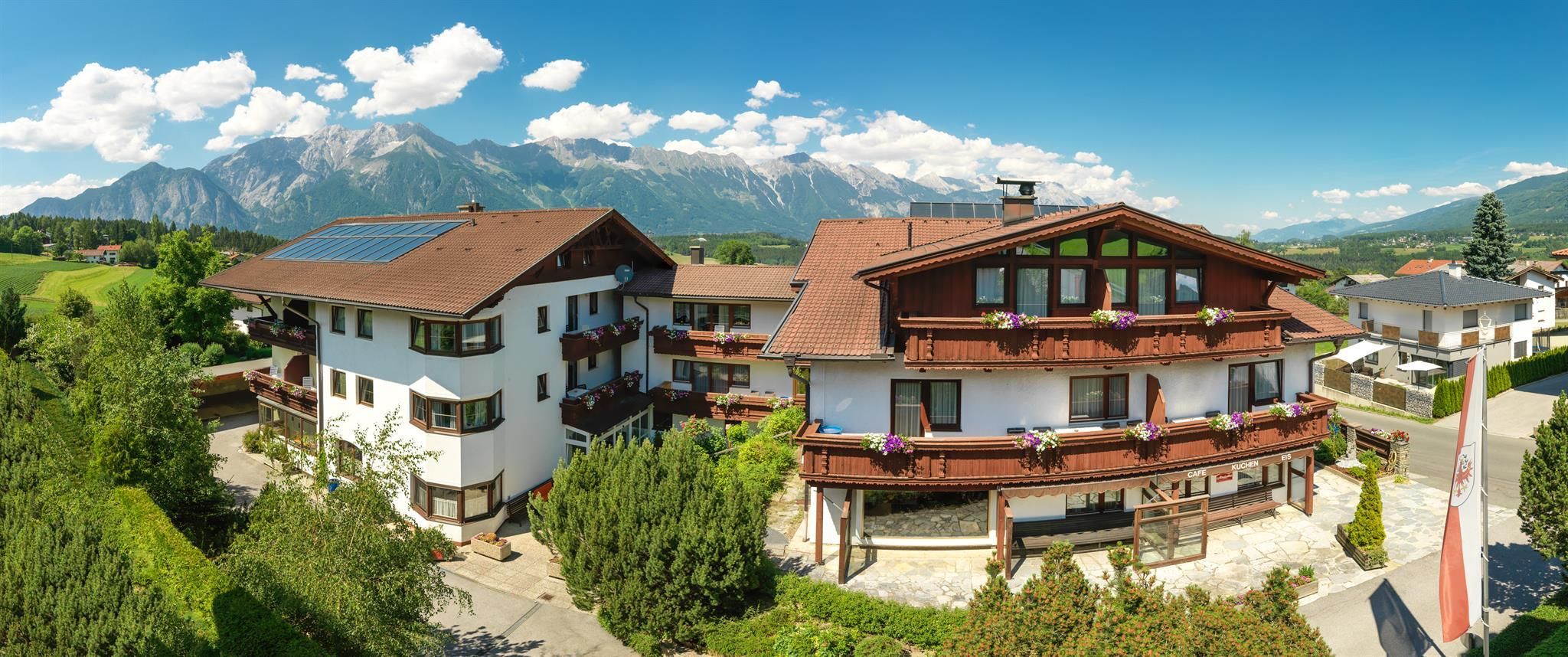 Das familiäre 3 Sterne-Hotel ist etwa fünf Gehminuten vom Ortszentrum und der Muttereralmbahn entfernt. Es bietet komfortable Zimmer mit insgesamt 50 Betten. Gäste schätzen besonders den kleine Wellnessbereich.Seit kurzem können im Hotel auf Anfrage auch zwei Ferienwohnungen gebucht werden: Eine großzügige Ferienwohnung, barrierefrei und komfortabel: • 160m² Wohnfläche – viel Platz für bis zu 6 Personen • 3 großzügige Schlafzimmer und 2 moderne Badezimmer • Rollstuhlgerechter Zugang und barrierefreie Einrichtung • Heller Wohnbereich mit Panoramafenstern und traumhaftem Bergblick • Voll ausgestattete Küche, ideal für Selbstversorger • Großer Balkon für entspannte Stunden in der Natur • Kostenloses WLAN und private Parkplätze Eine Ferienwohnung, gemütliches Alpenflair mit modernem Komfort • 65 m² Wohnfläche - Platz für bis zu 3 Personen • Balkon mit atemberaubendem Bergblick • Voll ausgestattete Küche und kostenfreies WLAN