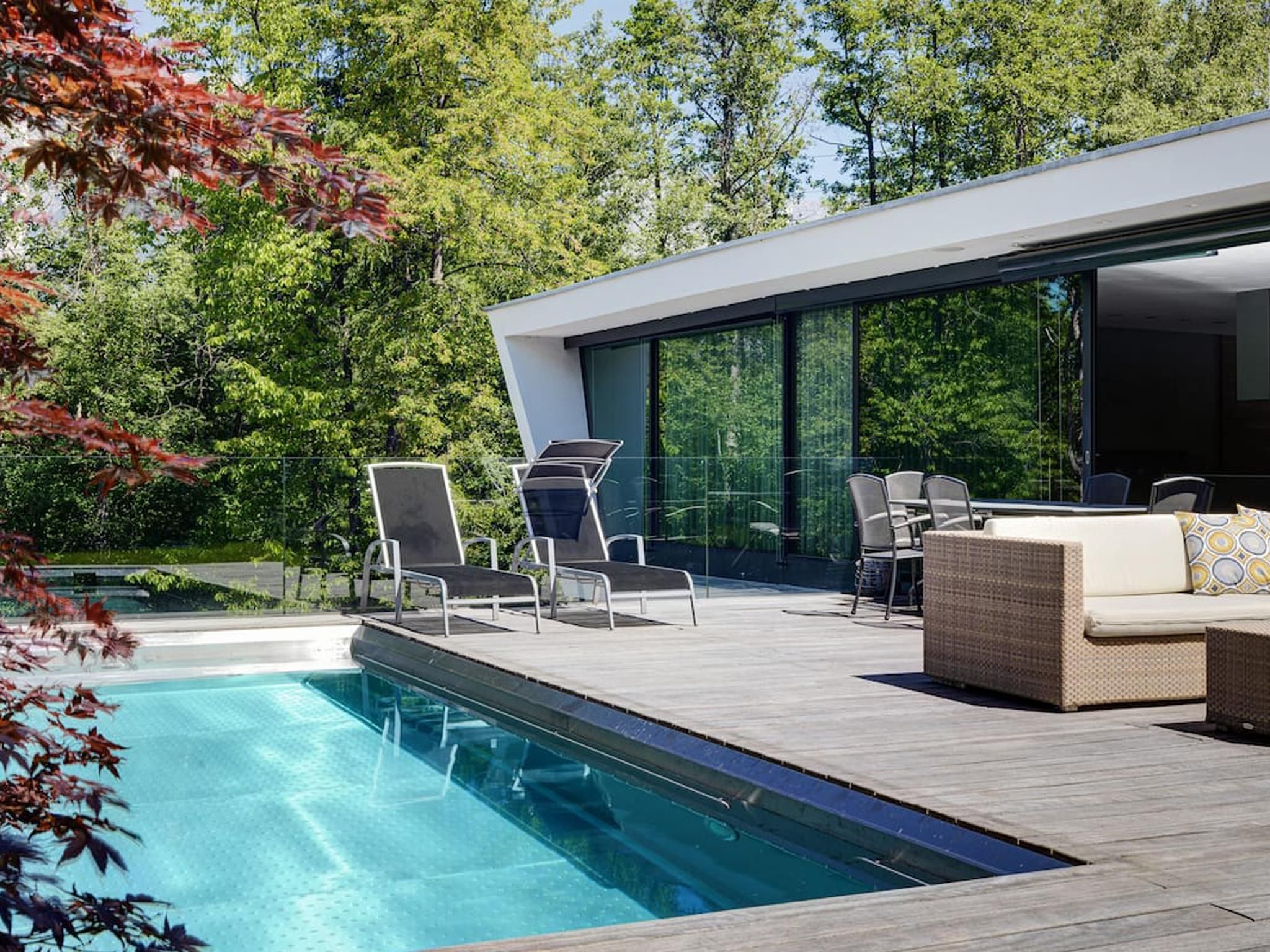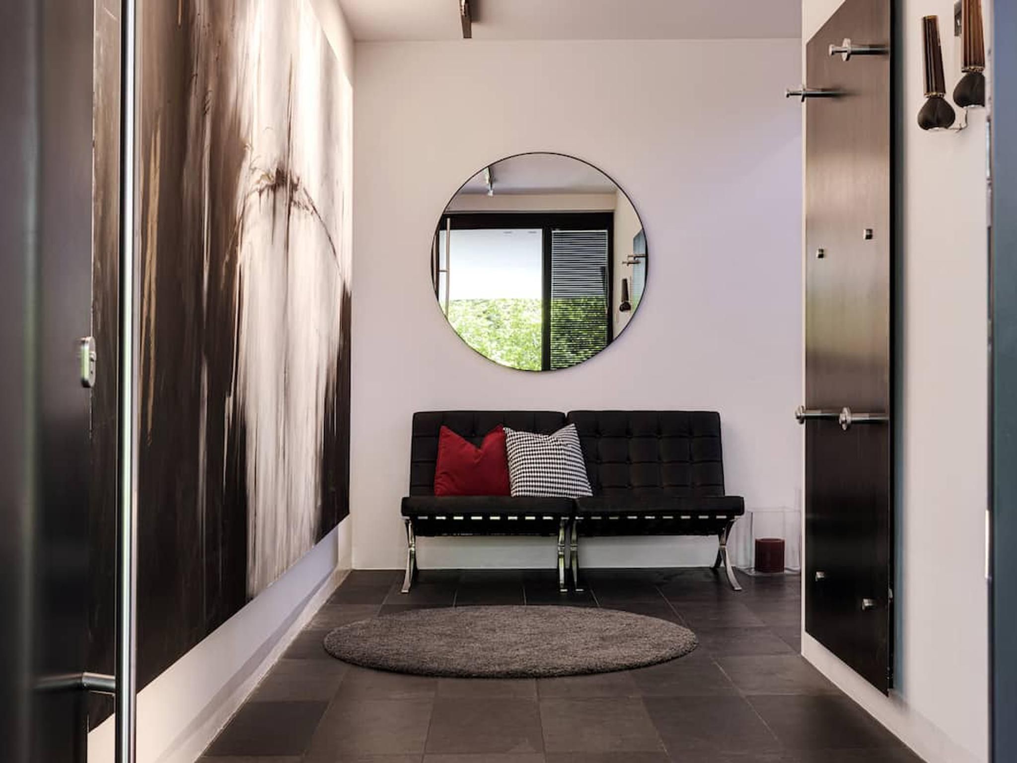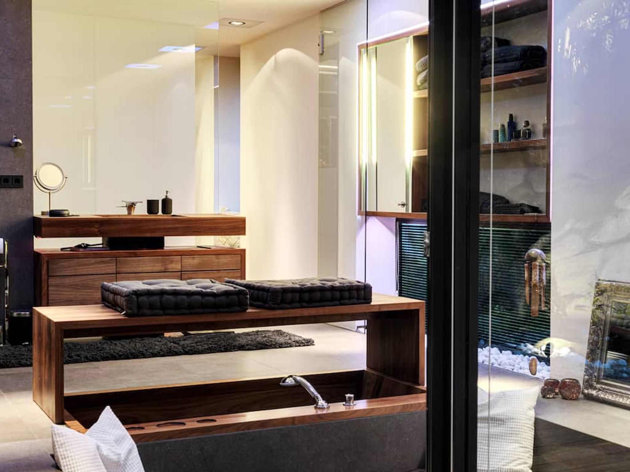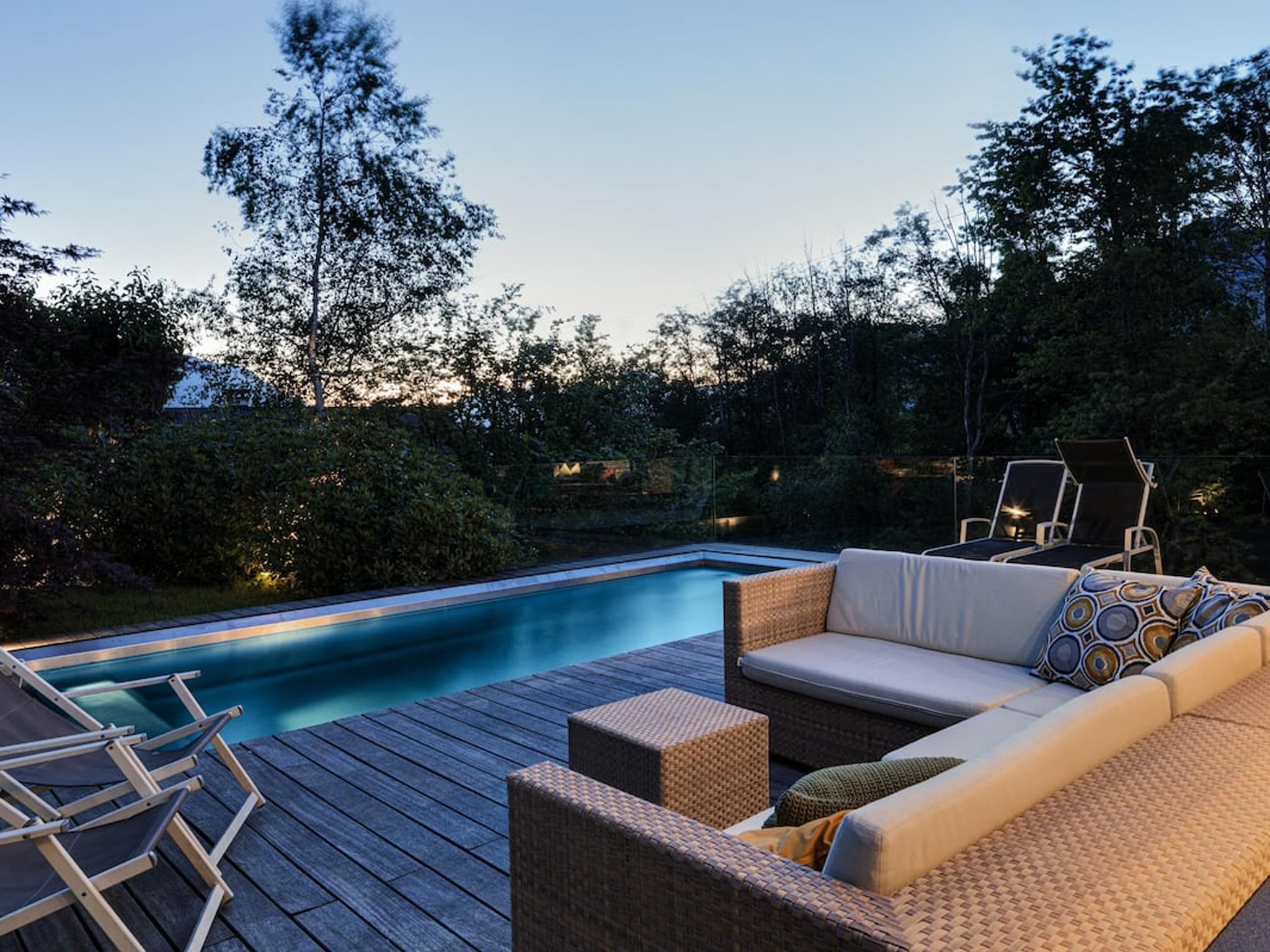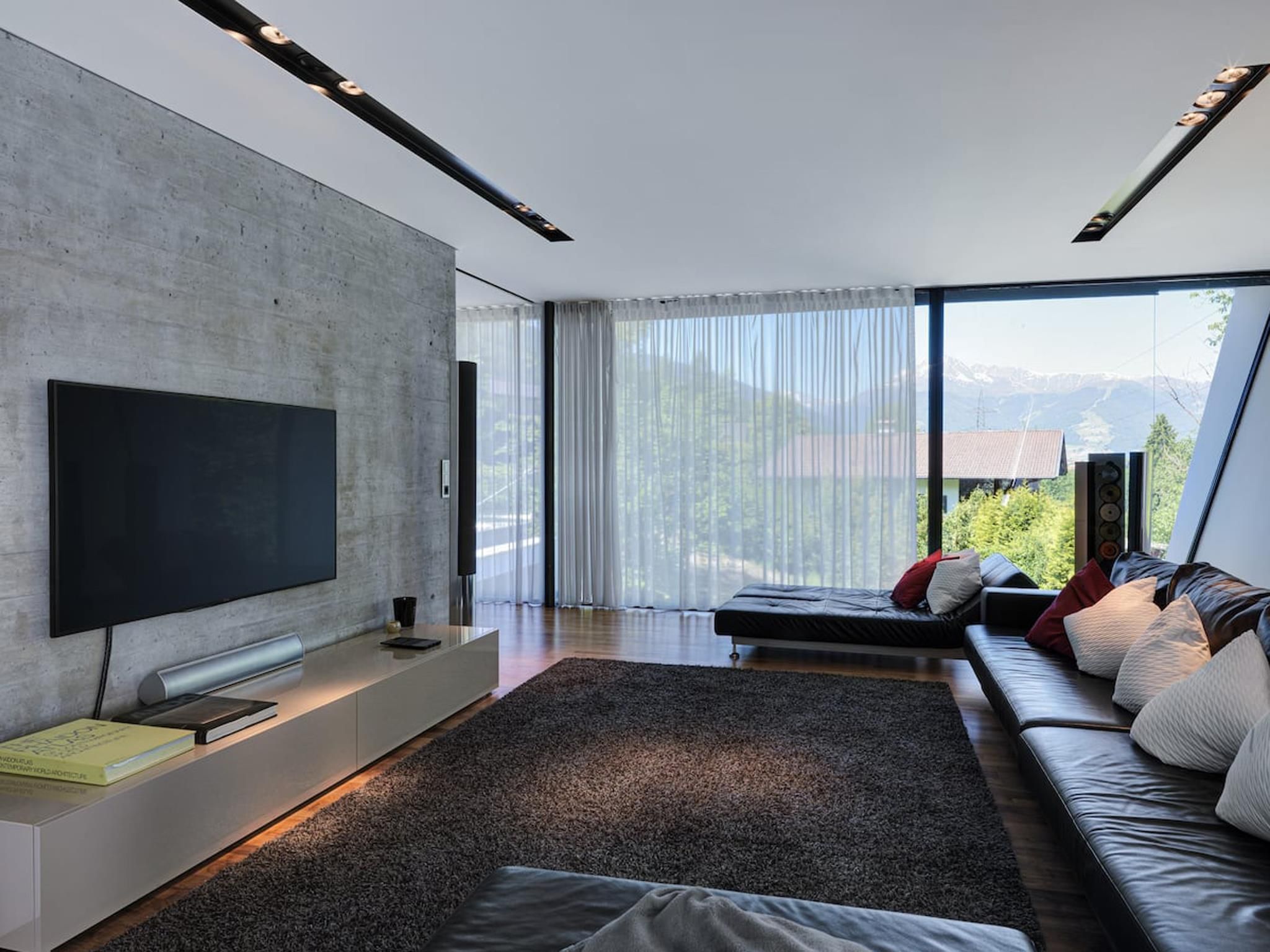 Diese wunderschöne Villa mit 300 m² Wohnfläche (verteilt auf drei Ebenen) liegt gut geschützt im Ortsteil Neu Götzens und bietet Platz für bis zu 8 Personen. Stilvolle und moderne Architektur sowie luxuriöse Innen- und Außenausstattung von renommierten, internationalen Designern. Integrierter Küchenbereich im großen Wohnbereich, 70-Zoll-HDTV und Bose-Sound-System sowie ein separater, voll ausgestatteter Businessbereich. Vier individuell eingerichtete Schlafzimmer, alle mit TV und eigenen Bädern. Ein Badezimmer mit integrierter Wellness und Relax Zone sowie blickgeschützter Terrasse. Fitnessraum mit verschiedenen hochwertigen Geräten, Boxsack, Gewichten, Yogamatten und separater Terrasse mit Blick auf den Wald. 1000 m² Gartenfläche mit Sonnenterrasse, Edelstahlpool, schattigem Pavillon aus Holz und Stein, Feuerstelle mit Außenküche und vieles mehr. Große integrierte Doppelgarage mit eigenem Hauszugang sowie großer Vorplatz zum Parken direkt vor der Villa. Das gesamte Anwesen ist videoüberwacht. Ein kleiner, privater Steig führt direkt zum nahe gelegenen Natterer See. Das Dorfzentrum Götzens ist in ca. 20 Gehminuten erreichbar.