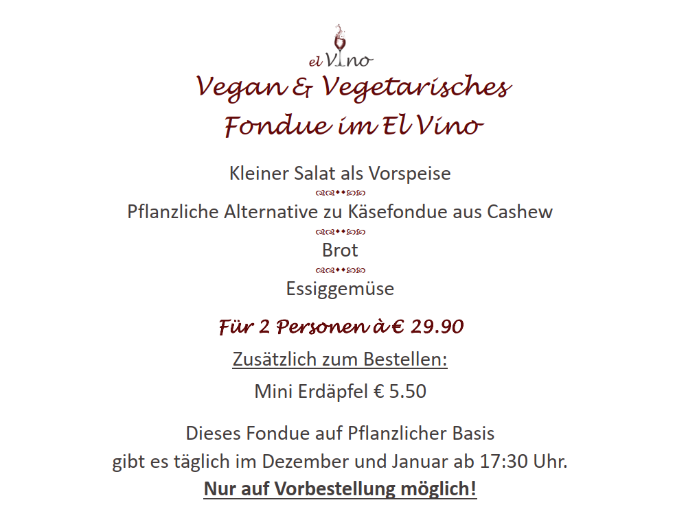 Veganes & Vegetarisches Fondue auf Chasew Basis - El VinoOrt: Reutte : 03. Dez. 2025 - 31. Jan. 2026 Zum EventZum Event: Veganes & Vegetarisches Fondue auf Chasew Basis - El Vino