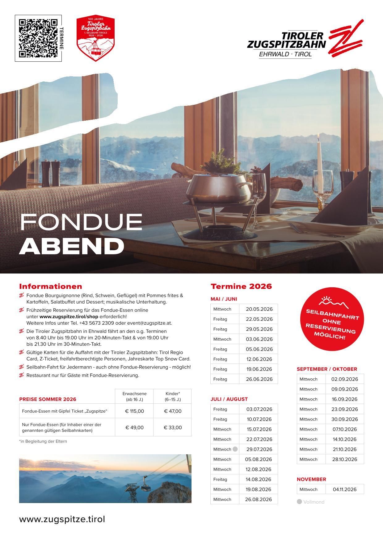 Flyer 2026 © Tiroler Zugspitzbahn Fondue-Abend ZugspitzeOrt:Ehrwald:20. Mai 2026 - 04. Nov. 2026:Zum EventZum Event: Fondue-Abend Zugspitze