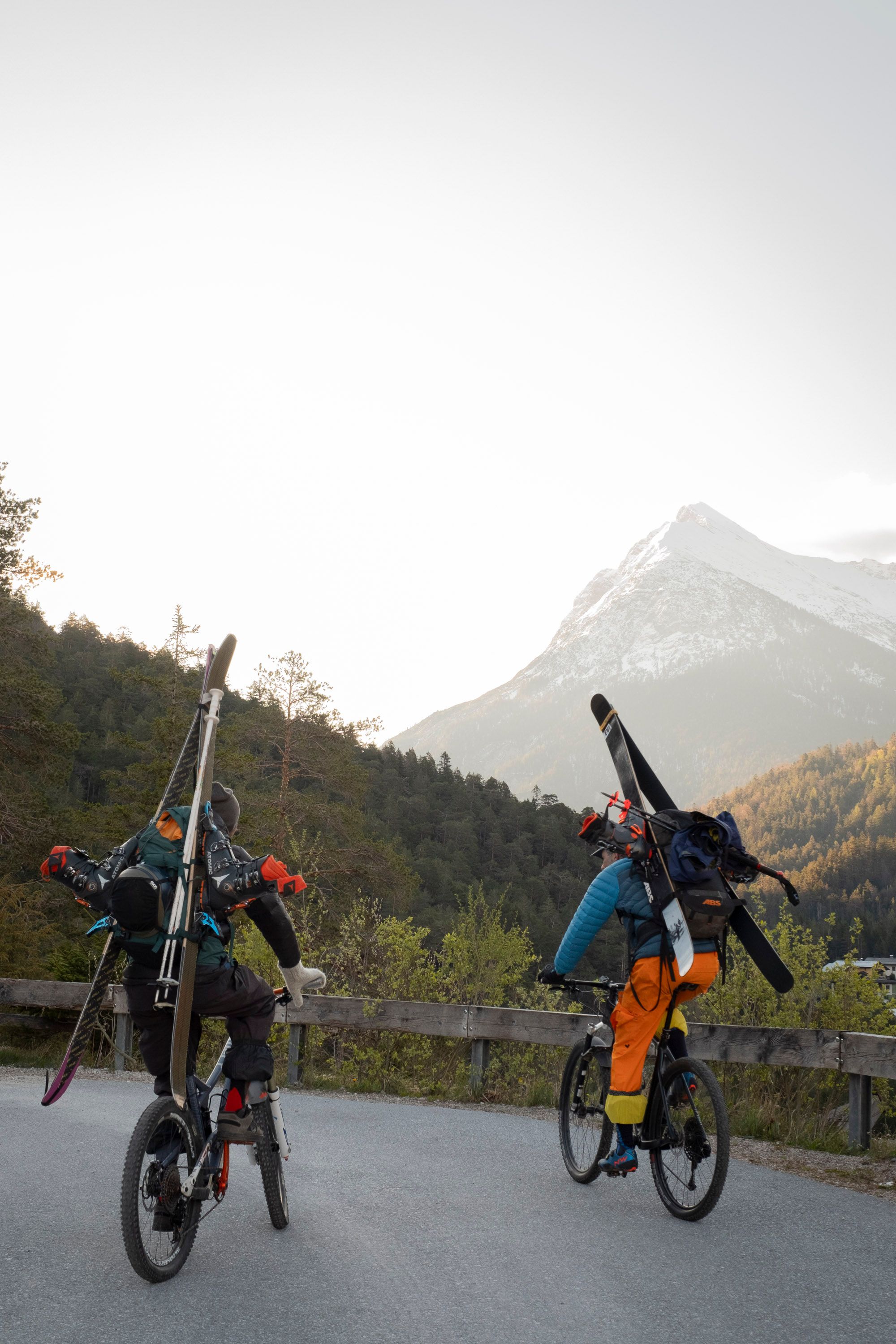 Klimawandel und Verbesserungen der Ausrüstung haben einen Minitrend ausgelöst: Mountainbike- plus Skitour als nachhaltige Frühlingskombination. Was als Tagesunternehmung klassisch kaum zu schaffen ist, wird mit leichten Skiern auf dem Rucksack und rollender Anfahrt zu einem einzigen Vergnügen.